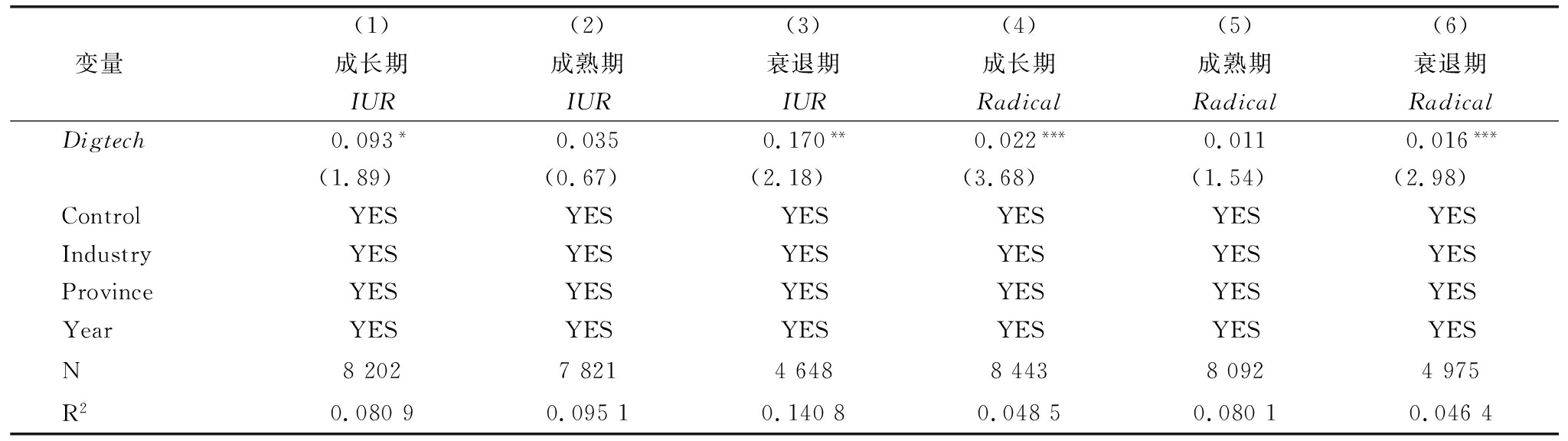 (1)(2)(3)(4)(5)(6)变量 成长期成熟期衰退期成长期成熟期衰退期IURIURIURRadicalRadicalRadicalDigtech0.093*0.0350.170**0.022***0.0110.016***(1.89)(0.67)(2.18)(3.68)(1.54)(2.98)ControlYESYESYESYESYESYESIndustryYESYESYESYESYESYESProvinceYESYESYESYESYESYESYearYESYESYESYESYESYESN820278214648844380924975R20.08090.09510.14080.04850.08010.0464