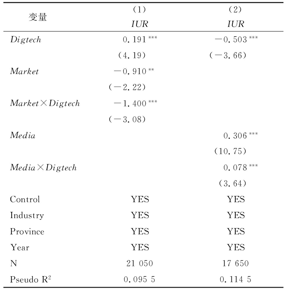变量 (1)(2)IURIURDigtech0.191***-0.503***(4.19)(-3.66)Market-0.910**(-2.22)Market×Digtech-1.400***(-3.08)Media0.306***(10.75)Media×Digtech0.078***(3.64)ControlYESYESIndustryYESYESProvinceYESYESYearYESYESN2105017650PseudoR20.09550.1145