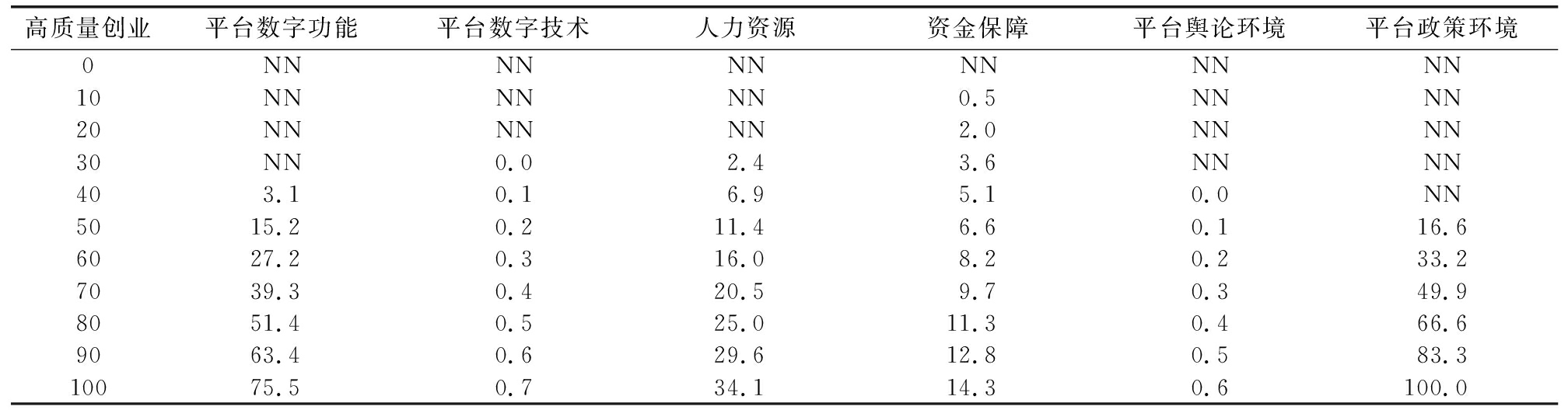 高质量创业平台数字功能平台数字技术人力资源资金保障平台舆论环境平台政策环境0NNNNNNNNNNNN10NNNNNN0.5NNNN20NNNNNN2.0NNNN30NN0.02.43.6NNNN403.10.16.95.10.0NN5015.20.211.46.60.116.66027.20.316.08.20.233.27039.30.420.59.70.349.98051.40.525.011.30.466.69063.40.629.612.80.583.310075.50.734.114.30.6100.0