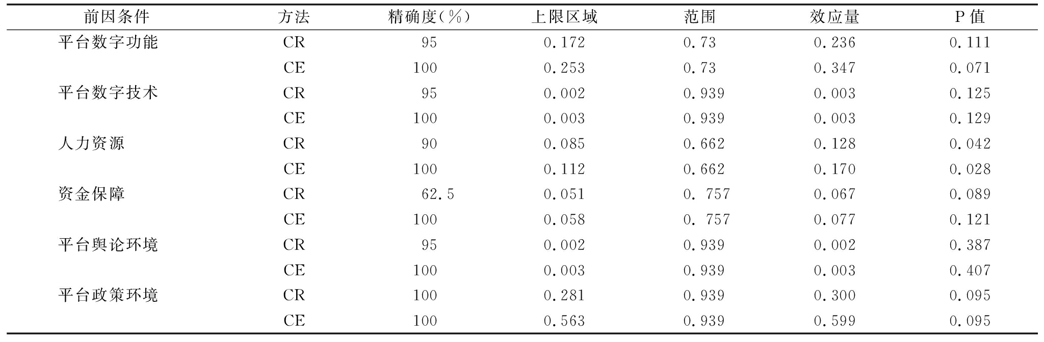 前因条件方法精确度(%)上限区域范围效应量P值平台数字功能CR950.1720.730.2360.111CE1000.2530.730.3470.071平台数字技术CR950.0020.9390.0030.125CE1000.0030.9390.0030.129人力资源CR900.0850.6620.1280.042CE1000.1120.6620.1700.028资金保障CR62.50.0510.7570.0670.089CE1000.0580.7570.0770.121平台舆论环境CR950.0020.9390.0020.387CE1000.0030.9390.0030.407平台政策环境CR1000.2810.9390.3000.095CE1000.5630.9390.5990.095