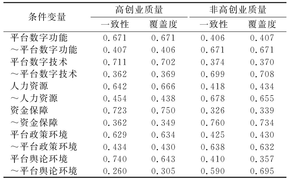 表6为NCA方法瓶颈水平分析结果。结果显示,要达到90%水平的高创业质量,需要63.4%水平的平台数字功能、0.6%水平的平台数字技术、29.6 %水平的人力资源、12.8 %水平的资金保障、0.5%水平的平台舆论环境以及83.3%水平的平台政策环境。本文进一步采用fsQCA对数字平台创业质量单个条件的必要性进行稳健性检验,结果如表7所示。从中可见,单一前因条件的一致性均低于0.9,说明本文中所有单个前因条件均非必要条件,单个条件对结果的解释力较弱。因此,从系统观视角对创业质量进行组态分析很有必要。