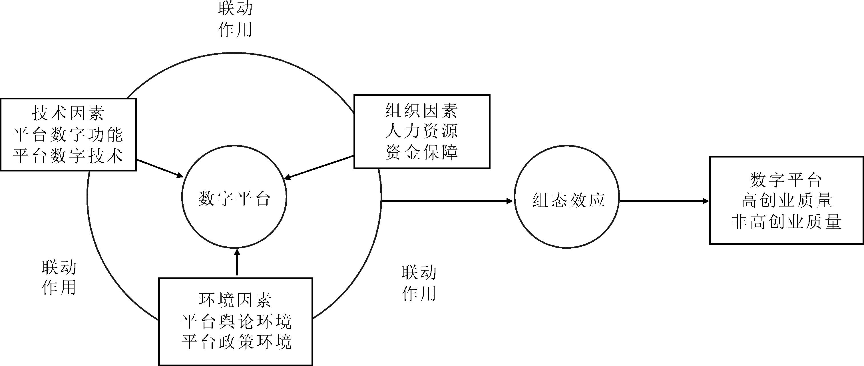 数字平台创业是数字技术情境下创业的一种新形态,是数字技术在创业场域的创新应用。“技术—组织—环境”TOE框架本质上是基于技术应用情景的综合性分析框架(邱泽奇,2017),可根据不同行业领域选择技术、组织、环境3个维度内容。因此,TOE框架与数字平台创业问题在研究情景上具有较高契合度。此外,与传统创业形式不同,数字平台创业是平台企业、用户、互补者协同合作、共同作用的结果。参与者之间相互依赖、资源互补,使得数字平台创业呈现出复杂多维的动态特征[7]。通过识别单一因素解决数字平台创业的复杂问题较为困难,且难以令人信服。数字平台创业受多层次前因交叉条件的影响,不仅包括数字平台技术和平台功能,也包括与技术特征相匹配的组织内部协同因素和环境因素[8]。可见,从研究内容看,TOE研究框架与本研究具有较高的适应性。因此,本文基于TOE理论框架,综合考虑技术、组织、环境3个层面的前因条件,构建影响数字平台创业质量的理论模型,探究不同层面前因条件组合与数字平台创业质量的复杂因果关系。