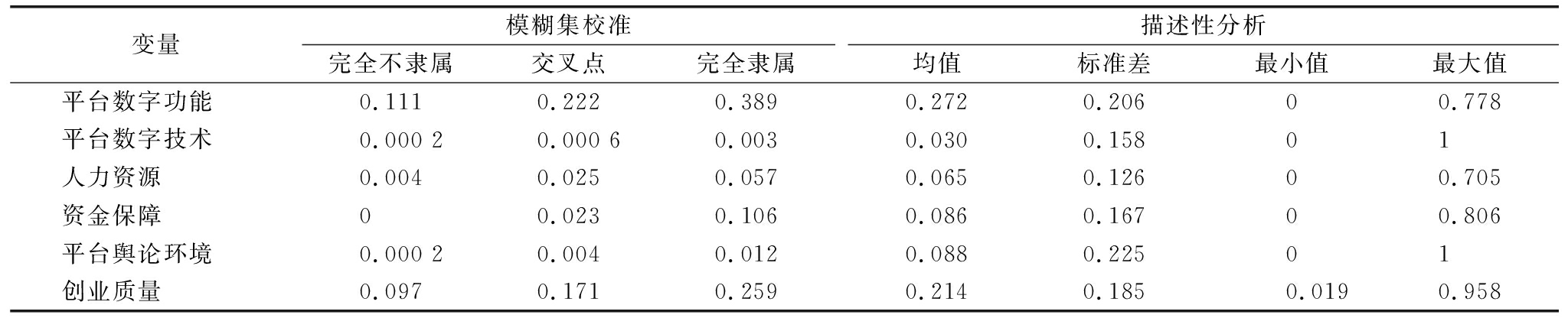 校准是指根据锚点为案例前因条件和结果赋予集合隶属分数的过程。参考Fiss等[23]的研究,将平台数字功能、平台数字技术、人力资源、资金保障、平台舆论环境5个前因变量与结果变量按照案例数据的上分位数(75%)、中位数(50%)、下分位数(25%)分别设定完全隶属、交叉点和完全不隶属3种。由于平台政策环境变量为0-1变量,故不进行校准。各变量校准锚点设定及描述性统计结果见表4。由表4可知,各前因变量最小值均为0,平台数字技术与平台舆论环境最大值均为1,平台数字功能、人力资源、资金保障最大值分别为0.778、0.705、0.806,而创业质量的最小值为0.019,最大值达到0.958。