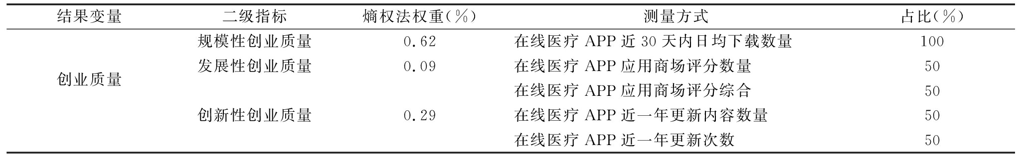 结果变量二级指标熵权法权重(%)测量方式占比(%)创业质量规模性创业质量0.62在线医疗APP近30天内日均下载数量100发展性创业质量0.09在线医疗APP应用商场评分数量50在线医疗APP应用商场评分综合50创新性创业质量0.29在线医疗APP近一年更新内容数量50在线医疗APP近一年更新次数50