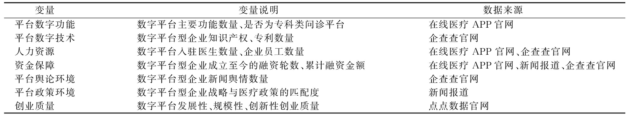 本文重点研究影响数字平台创业质量的前因组态,研究对象为数字平台。基于数据可得性,以点点数据平台在线医疗类应用排行榜IOS系统中100个在线医疗APP为研究对象。初始样本筛选原则如下:①案例兼具异质性和同质性特征,样本需满足数字平台创业质量差异化的要求,且具备高质量创业和低质量创业可比性特征;②符合数字平台特征。在进行案例选择时,应保证选取的数字平台均为在线医疗APP,且能够获取相关信息。本文收集在线医疗数字平台相应数据资料,鉴于数据完整性,最终确定40个研究样本,数据来源于企查查官网、点点数据网、新闻报道、在线医疗APP官网。变量说明与数据来源见表1。