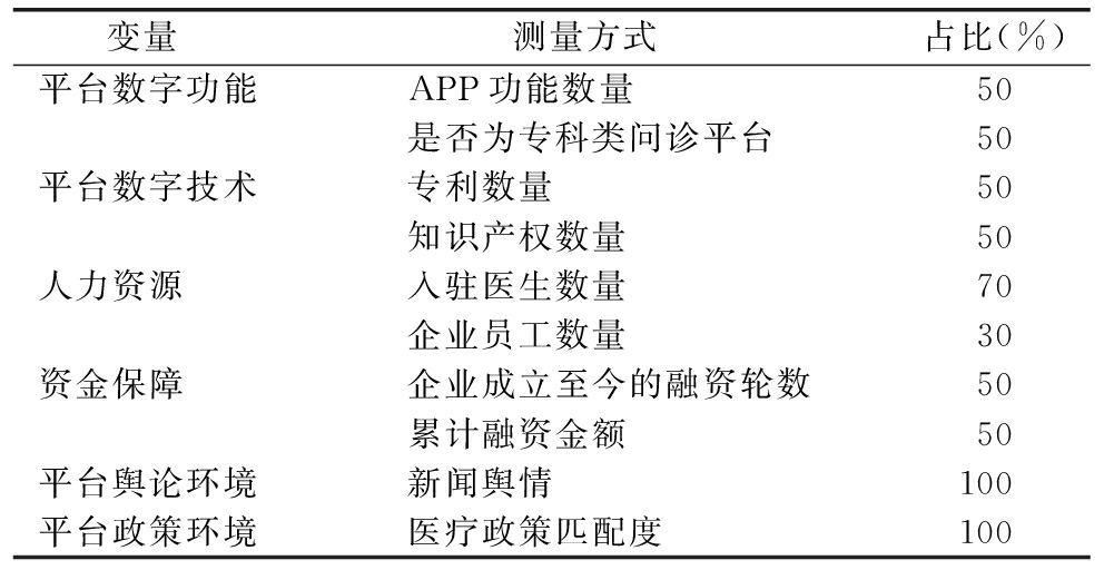 变量 测量方式 占比(%)平台数字功能APP功能数量50是否为专科类问诊平台50平台数字技术专利数量50知识产权数量50人力资源入驻医生数量70企业员工数量30资金保障企业成立至今的融资轮数50累计融资金额50平台舆论环境新闻舆情100平台政策环境医疗政策匹配度100