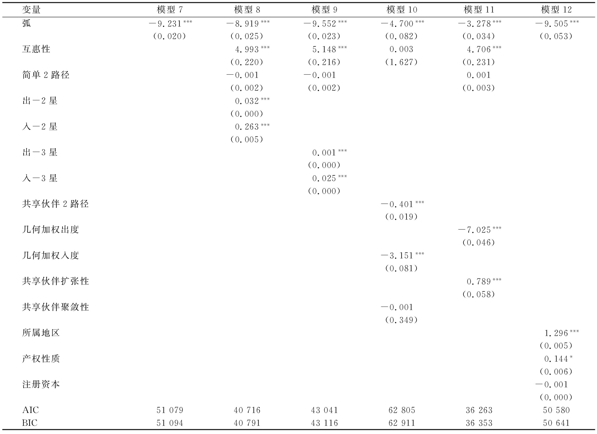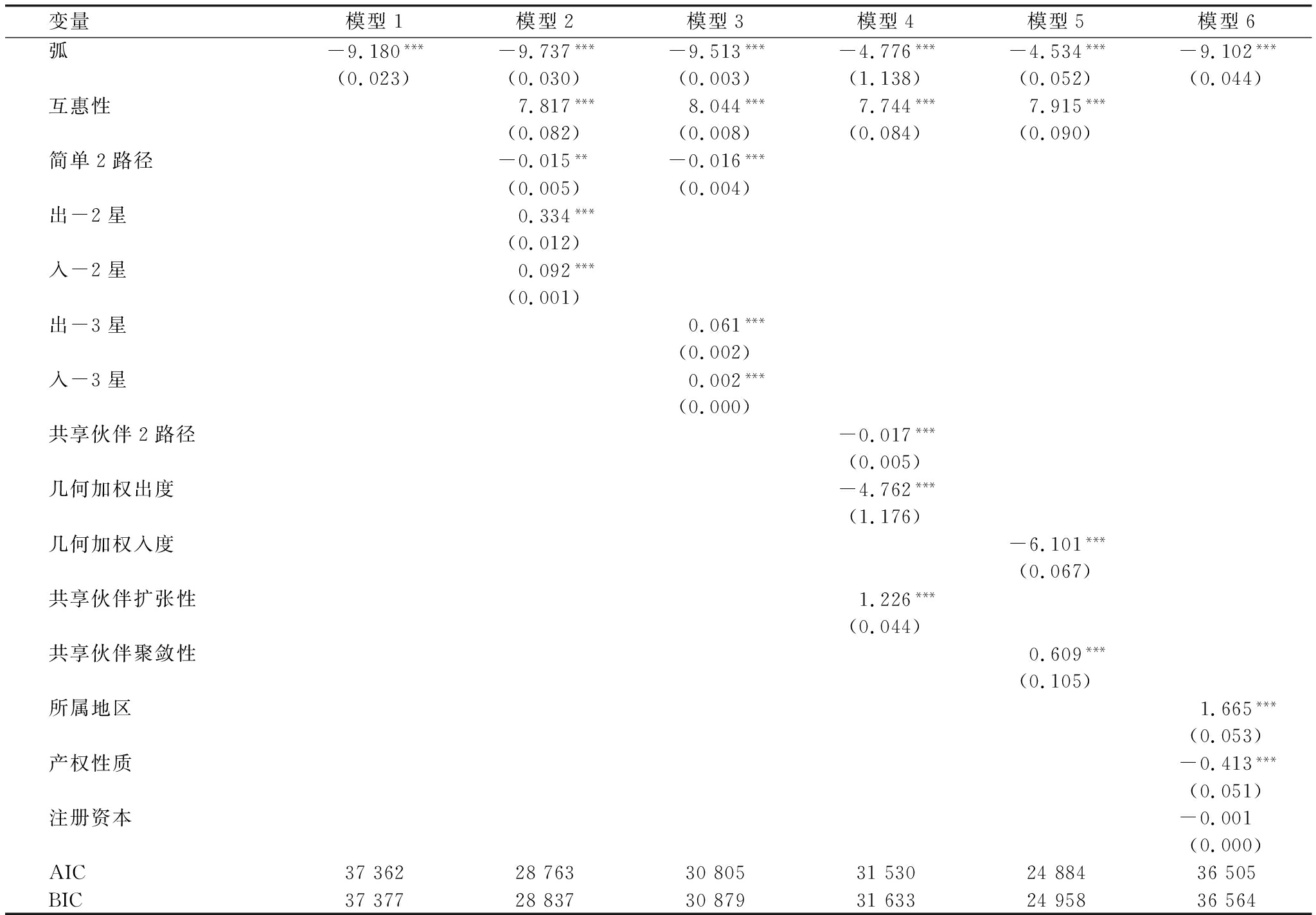 变量模型1模型2模型3模型4模型5模型6弧-9.180***-9.737***-9.513***-4.776***-4.534***-9.102***(0.023)(0.030)(0.003)(1.138)(0.052)(0.044)互惠性7.817***8.044***7.744***7.915***(0.082)(0.008)(0.084)(0.090)简单2路径-0.015**-0.016***(0.005)(0.004)出-2星0.334***(0.012)入-2星0.092***(0.001)出-3星0.061***(0.002)入-3星0.002***(0.000)共享伙伴2路径-0.017***(0.005)几何加权出度-4.762***(1.176)几何加权入度-6.101***(0.067)共享伙伴扩张性1.226***(0.044)共享伙伴聚敛性0.609***(0.105)所属地区1.665***(0.053)产权性质-0.413***(0.051)注册资本-0.001(0.000)AIC373622876330805315302488436505BIC373772883730879316332495836564
