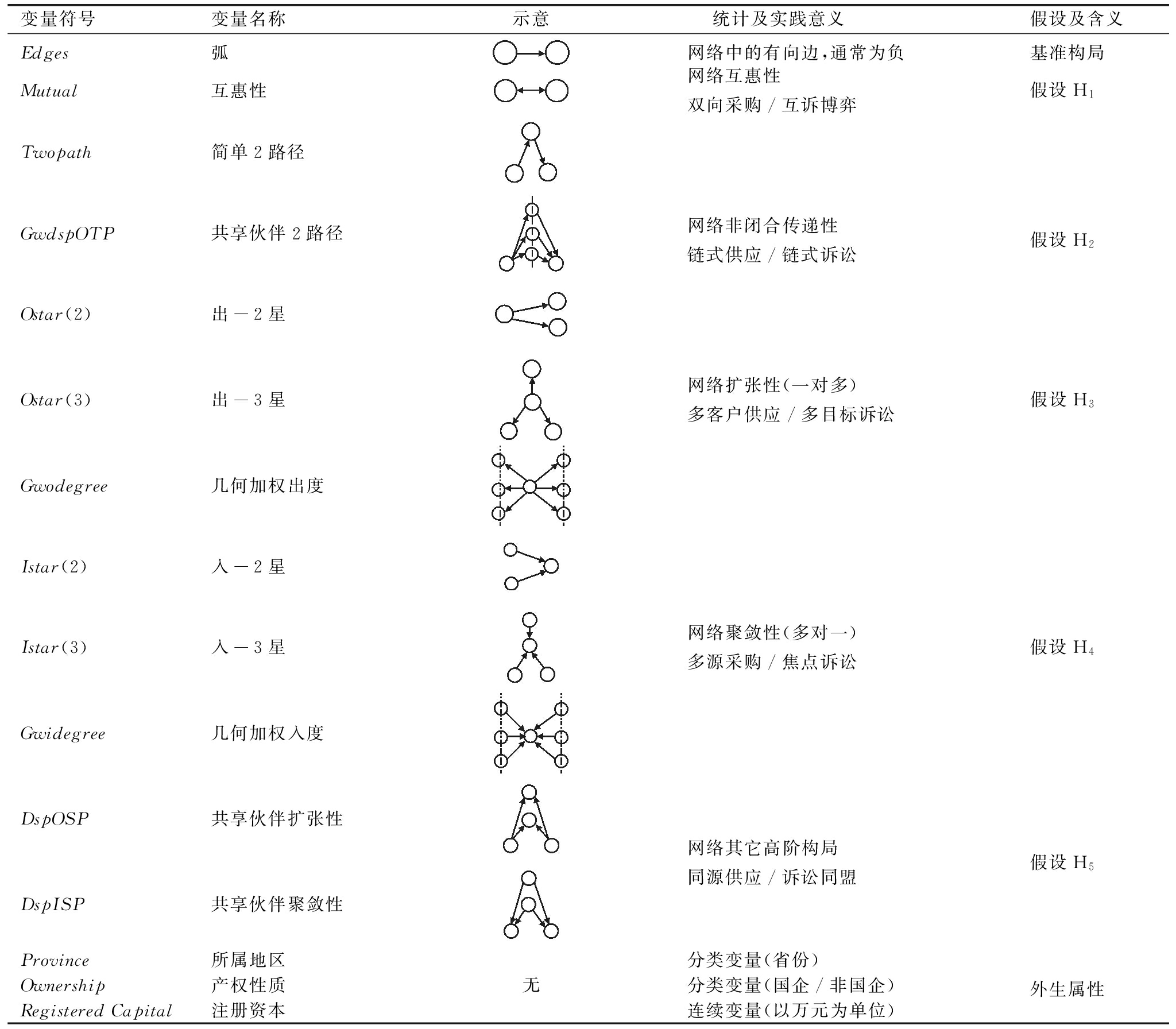 变量符号变量名称示意统计及实践意义假设及含义Edges弧网络中的有向边,通常为负基准构局Mutual互惠性网络互惠性双向采购/互诉博弈假设H1Twopath简单2路径网络非闭合传递性链式供应/链式诉讼假设H2GwdspOTP共享伙伴2路径Ostar(2)出-2星Ostar(3)出-3星网络扩张性(一对多)多客户供应/多目标诉讼假设H3Gwodegree几何加权出度Istar(2)入-2星Istar(3)入-3星网络聚敛性(多对一)多源采购/焦点诉讼假设H4Gwidegree几何加权入度DspOSP共享伙伴扩张性网络其它高阶构局同源供应/诉讼同盟假设H5DspISP共享伙伴聚敛性Province所属地区分类变量(省份)外生属性Ownership产权性质无分类变量(国企/非国企)RegisteredCapital注册资本连续变量(以万元为单位)