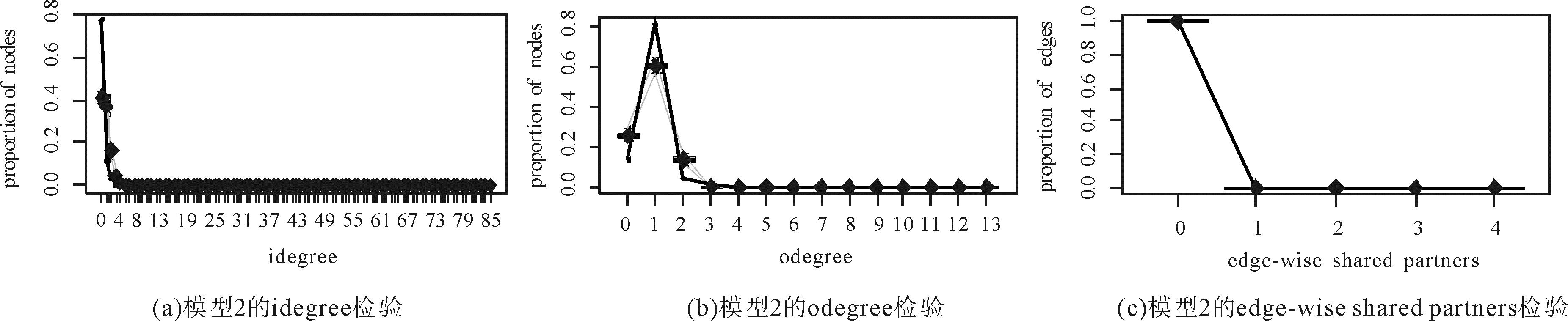 随着方法的完善,ERGM对网络关系出现概率具有较强的解释力。作为针对网络边建模的工具,它具有模型拟合优势,能够通过网络采样方法解决传统回归模型无法测度结构效应的问题[23]。ERGM强调网络节点间的互相依赖,并兼顾网络内生结构与外生因素,通过基于马尔科夫链的建模,借助估计、诊断、模拟、对比等步骤最大程度地实现对网络动力机制的探索[4]。