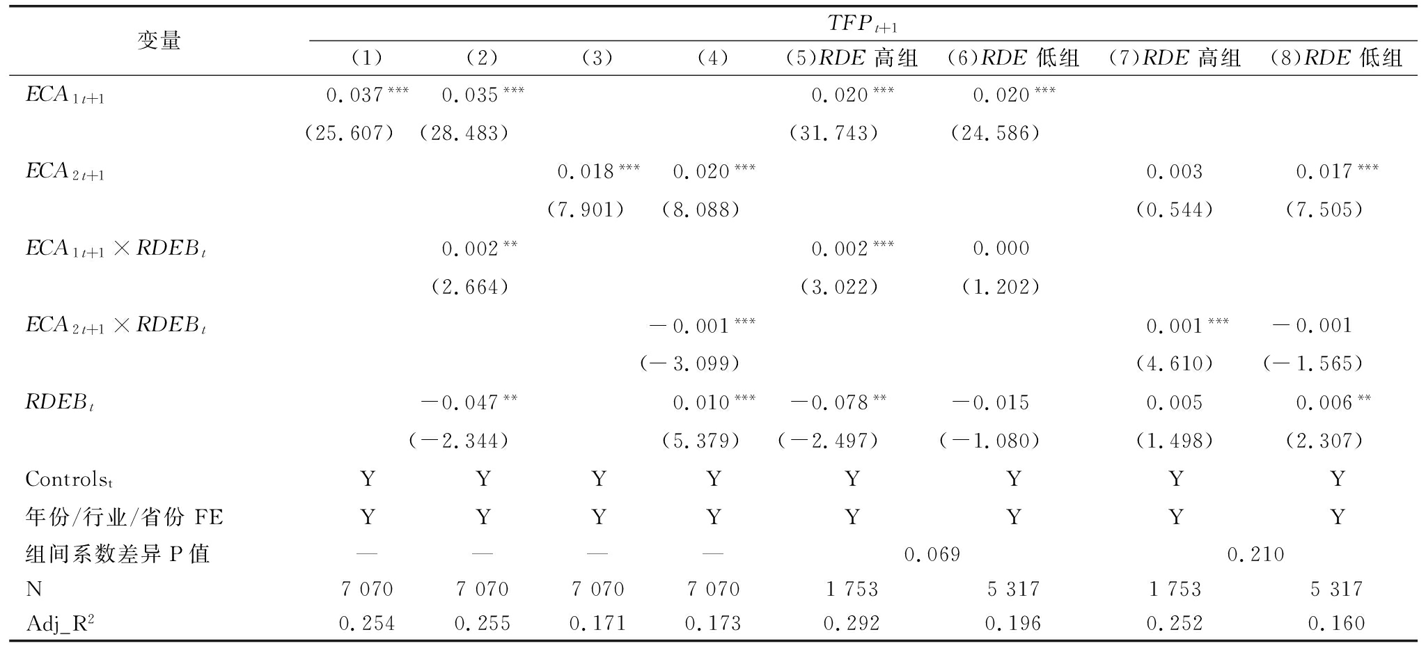 变量TFPt+1(1)(2)(3)(4)(5)RDE高组(6)RDE低组(7)RDE高组(8)RDE低组ECA1t+10.037***0.035***0.020***0.020***(25.607)(28.483)(31.743)(24.586)ECA2t+10.018***0.020***0.0030.017***(7.901)(8.088)(0.544)(7.505)ECA1t+1×RDEBt0.002**0.002***0.000(2.664)(3.022)(1.202)ECA2t+1×RDEBt-0.001***0.001***-0.001(-3.099)(4.610)(-1.565)RDEBt-0.047**0.010***-0.078**-0.0150.0050.006**(-2.344)(5.379)(-2.497)(-1.080)(1.498)(2.307)ControlstYYYYYYYY年份/行业/省份FEYYYYYYYY组间系数差异P值————0.0690.210N70707070707070701753531717535317Adj_R20.2540.2550.1710.1730.2920.1960.2520.160
