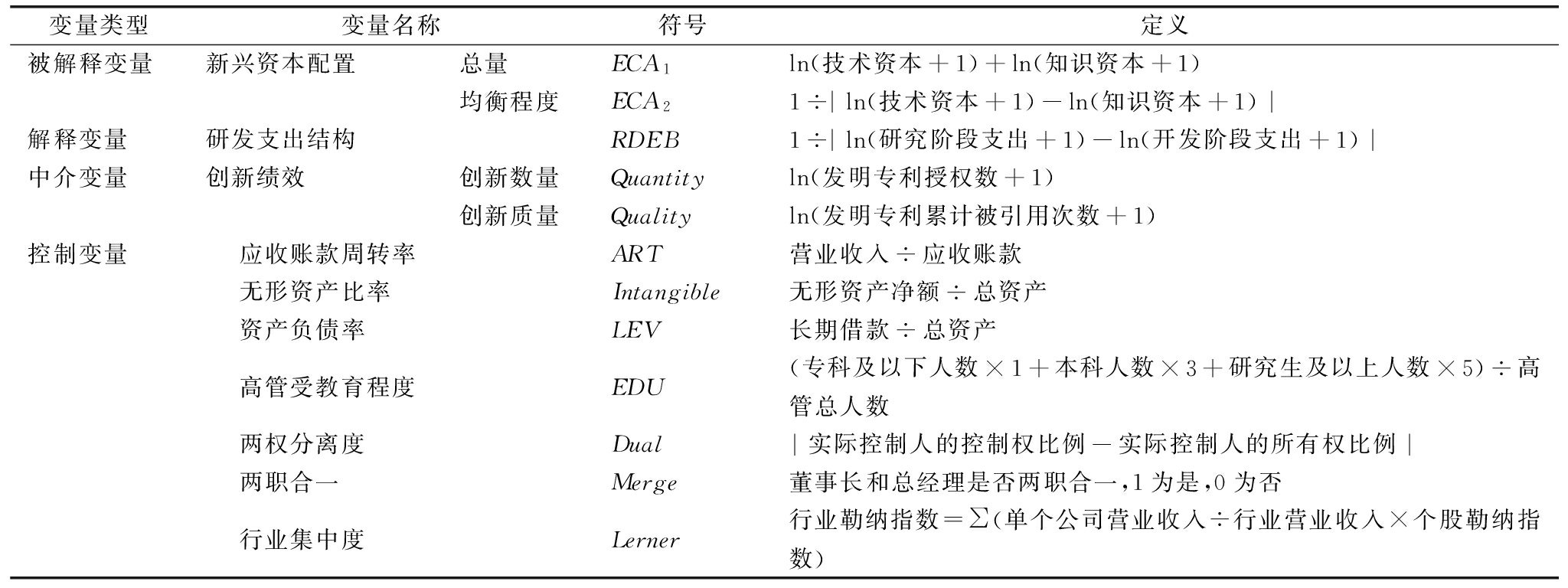 参考王京等[12]、原毅军等(2019)的研究成果,本文选择其它可能影响企业新兴资本配置的因素作为控制变量,具体包括应收账款周转率(ART)、无形资产比率(Intangible)、资产负债率(LEV)、高管受教育程度(EDU)、两权分离度(Dual)、两职合一(Merge)、行业集中度(Lerner)。为控制随时间变化的宏观环境及企业所在行业和地理位置特征的影响,本文加入年份(Year)、行业(Industry)和省份(Province)固定效应。具体变量定义见表1。