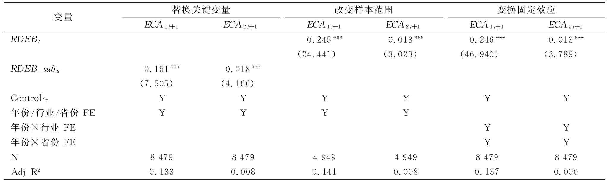 变量替换关键变量ECA1t+1ECA2t+1改变样本范围ECA1t+1ECA2t+1变换固定效应ECA1t+1ECA2t+1RDEBt0.245***0.013***0.246***0.013***(24.441)(3.023)(46.940)(3.789)RDEB_subit0.151***0.018***(7.505)(4.166)ControlstYYYYYY年份/行业/省份FEYYYY年份×行业FEYY年份×省份FEYYN847984794949494984798479Adj_R20.1330.0080.1410.0080.1370.000