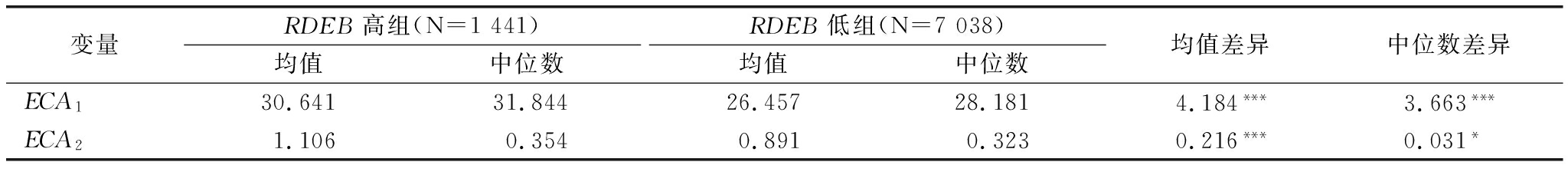变量RDEB高组(N=1441)均值中位数RDEB低组(N=7038)均值中位数均值差异中位数差异ECA130.64131.84426.45728.1814.184***3.663***ECA21.1060.3540.8910.3230.216***0.031*