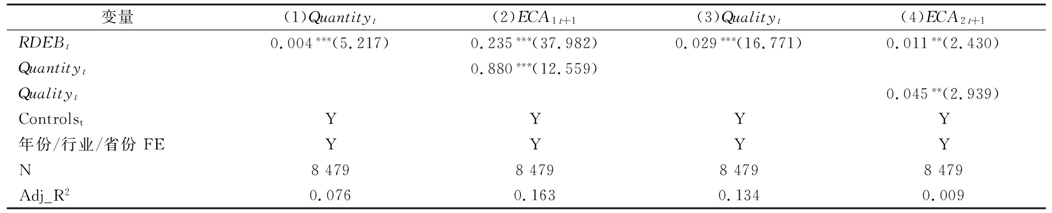 变量(1)Quantityt(2)ECA1t+1(3)Qualityt(4)ECA2t+1RDEBt0.004***(5.217)0.235***(37.982)0.029***(16.771)0.011**(2.430)Quantityt0.880***(12.559)Qualityt0.045**(2.939)ControlstYYYY年份/行业/省份FEYYYYN8479847984798479Adj_R20.0760.1630.1340.009