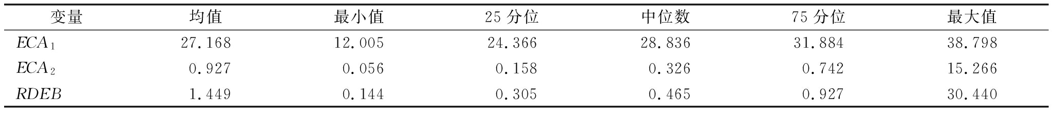 变量均值最小值25分位中位数75分位最大值ECA127.16812.00524.36628.83631.88438.798ECA20.9270.0560.1580.3260.74215.266RDEB1.4490.1440.3050.4650.92730.440