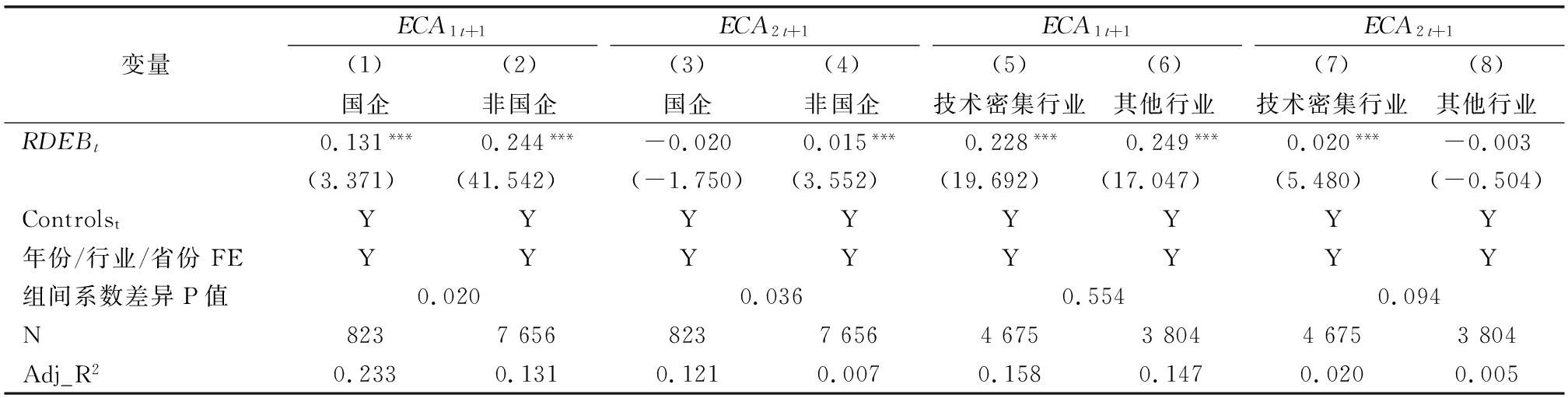 变量ECA1t+1(1)国企(2)非国企ECA2t+1(3)国企(4)非国企ECA1t+1(5)技术密集行业(6)其他行业ECA2t+1(7)技术密集行业(8)其他行业RDEBt0.131***0.244***-0.0200.015***0.228***0.249***0.020***-0.003(3.371)(41.542)(-1.750)(3.552)(19.692)(17.047)(5.480)(-0.504)ControlstYYYYYYYY年份/行业/省份FEYYYYYYYY组间系数差异P值0.0200.0360.5540.094N823765682376564675380446753804Adj_R20.2330.1310.1210.0070.1580.1470.0200.005