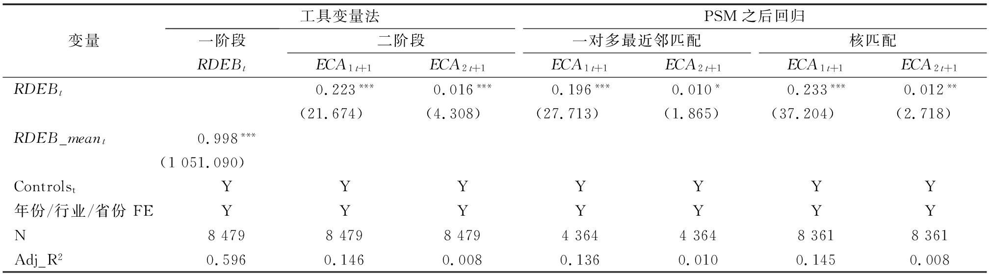 变量工具变量法一阶段RDEBt二阶段ECA1t+1ECA2t+1PSM之后回归一对多最近邻匹配ECA1t+1ECA2t+1核匹配ECA1t+1ECA2t+1RDEBt0.223***0.016***0.196***0.010*0.233***0.012**(21.674)(4.308)(27.713)(1.865)(37.204)(2.718)RDEB_meant0.998***(1051.090)ControlstYYYYYYY年份/行业/省份FEYYYYYYYN8479847984794364436483618361Adj_R20.5960.1460.0080.1360.0100.1450.008