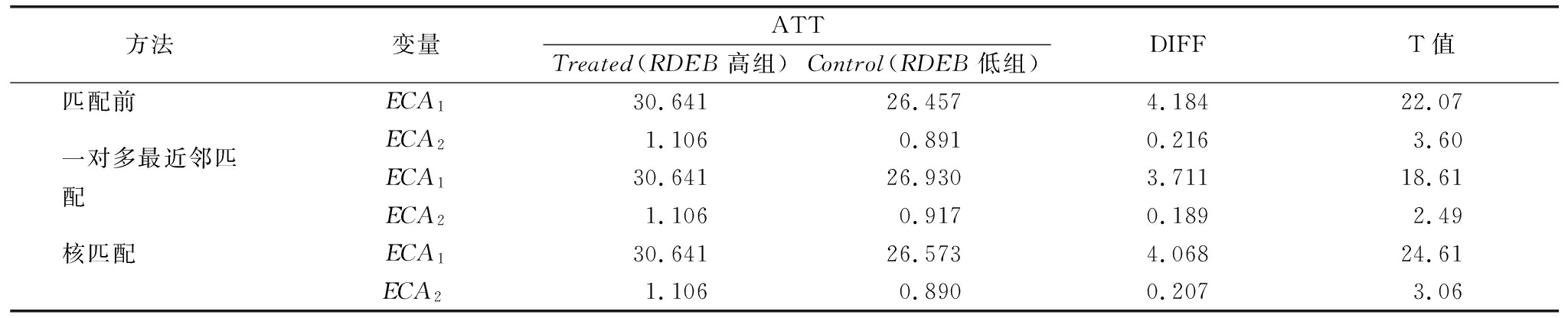 为控制样本选择偏误,本文采用倾向得分匹配法进行检验,按照RDEB均值将总样本分为研发支出结构均衡程度高组和研发支出结构均衡程度低组,分别作为处理组和对照组。以模型(1)中的控制变量(ART、Intangible、LEV、EDU、Dual、Merge、Lerner)作为匹配变量,分别使用一对三最近邻匹配、核匹配方法为处理组寻找特征相似的对照组,以满足平衡性和共同支撑假设。表6显示,在最近邻匹配方法情景下,ECA1、ECA2经匹配后的平均处理效应(ATT)差值分别为3.711、0.189且均显著。由此表明,与基本特征相似的RDEB低组企业相比,RDEB高组企业技术资本和知识资本存量更多且配置更均衡,证明企业研发支出结构均衡对新兴资本配置具有积极影响。核匹配方法情景下的结果一致。进一步地,将处理组和对照组样本分别代入模型(1)进行回归,如表5所示。结果显示,RDEB的系数依然显著为正,表明基准回归结论具有稳健性。