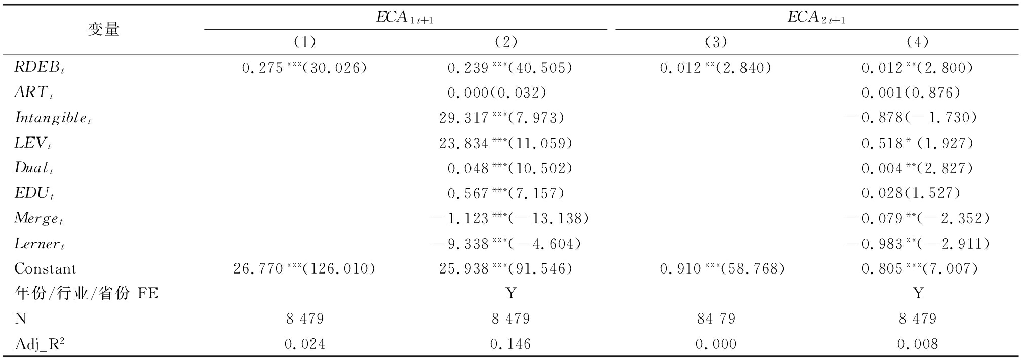 变量ECA1t+1(1)(2)ECA2t+1(3)(4)RDEBt0.275***(30.026)0.239***(40.505)0.012**(2.840)0.012**(2.800)ARTt0.000(0.032)0.001(0.876)Intangiblet29.317***(7.973)-0.878(-1.730)LEVt23.834***(11.059)0.518*(1.927)Dualt0.048***(10.502)0.004**(2.827)EDUt0.567***(7.157)0.028(1.527)Merget-1.123***(-13.138)-0.079**(-2.352)Lernert-9.338***(-4.604)-0.983**(-2.911)Constant26.770***(126.010)25.938***(91.546)0.910***(58.768)0.805***(7.007)年份/行业/省份FEYYN8479847984798479Adj_R20.0240.1460.0000.008
