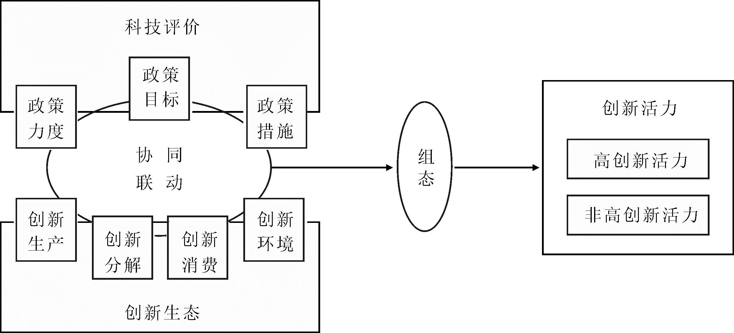 学者关于科技评价改革和创新生态营造涵盖的单个要素与创新活力关系的探讨,为深入解构创新活力奠定了一定的理论基础。然而,已有研究多基于对称性分析视角,未考察多重并发因素协同产生的组态效应[19]。科技评价改革和创新生态营造对激发创新活力的影响路径主要体现在以下两个方面:一方面,从制度视角看,科技评价改革对激发创新活力产生的“指挥棒”效应需要政策力度、政策目标和政策措施等多种政策的协同作用,不同政策相互作用、冲突或互补的指导原则可以形塑创新主体的创新活力。因此,需要关注不同科技评价政策之间的互动。另一方面,从系统视角看,创新生态系统涵盖创新生产者、创新分解者、创新消费者和创新环境,从源头、支撑、应用和根基方面为创新活力提供能量、服务、动力和保障,不同创新主体与创新环境的互动、兼容或排斥,共同刻画创新主体的创新活力(谢智敏等,2022)。因此,需关注不同创新主体之间的互动。从组态视角看,科技评价改革从宏观层面和整体层面为创新活力提供指导方向及原则,创新生态营造从微观层面和具体层面为创新活力提供资源及环境保障,科技评价改革和创新生态营造协同对创新活力具有制约作用。因此,需从宏观与微观相结合、整体与具体相融通、规划与落实相协同方面深入分析两者对创新活力的驱动路径,关注科技评价政策与创新主体之间的协同作用。