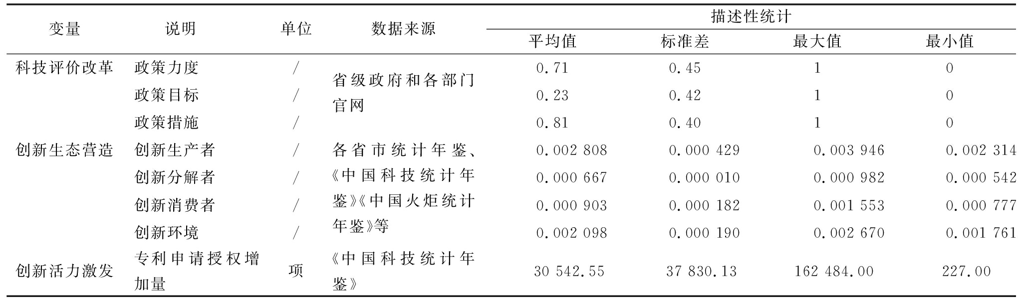(1)科技评价改革。科技评价改革主要从政策制度范畴进行考量,参考已有研究[1],本文根据各省份颁布的科技评价政策,从政策力度、政策目标和政策措施3个维度考察科技评价改革实施情况。具体评价标准为:如果省级人民代表大会及其常务委员会制定了科技评价相关法律法规,则政策力度评分为1;如果没有出台这些政策,则政策力度评分为0。若各省份科技评价政策制度对短期目标与长期目标进行详细概括(如明确具体期限内需要实现的评价目的),则将政策目标赋值为1,否则为0。若各省份对科技评价工作流程和标准进行详细规定(如对科技评价原则、指标体系、程序流程进行详细论述,并列举详细的时间表、工作表等给予科技评价全方位且强有力的支持),则将政策措施赋值为1,否则为0。