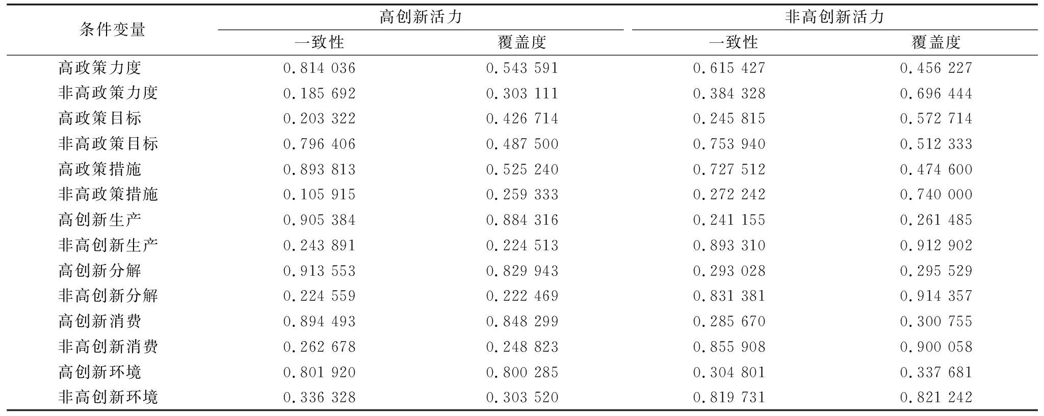 条件变量高创新活力一致性覆盖度非高创新活力一致性覆盖度高政策力度0.8140360.5435910.6154270.456227非高政策力度0.1856920.3031110.3843280.696444高政策目标0.2033220.4267140.2458150.572714非高政策目标0.7964060.4875000.7539400.512333高政策措施0.8938130.5252400.7275120.474600非高政策措施0.1059150.2593330.2722420.740000高创新生产0.9053840.8843160.2411550.261485非高创新生产0.2438910.2245130.8933100.912902高创新分解0.9135530.8299430.2930280.295529非高创新分解0.2245590.2224690.8313810.914357高创新消费0.8944930.8482990.2856700.300755非高创新消费0.2626780.2488230.8559080.900058高创新环境0.8019200.8002850.3048010.337681非高创新环境0.3363280.3035200.8197310.821242