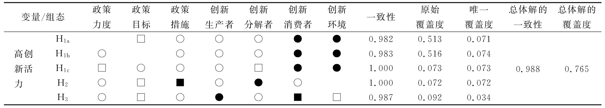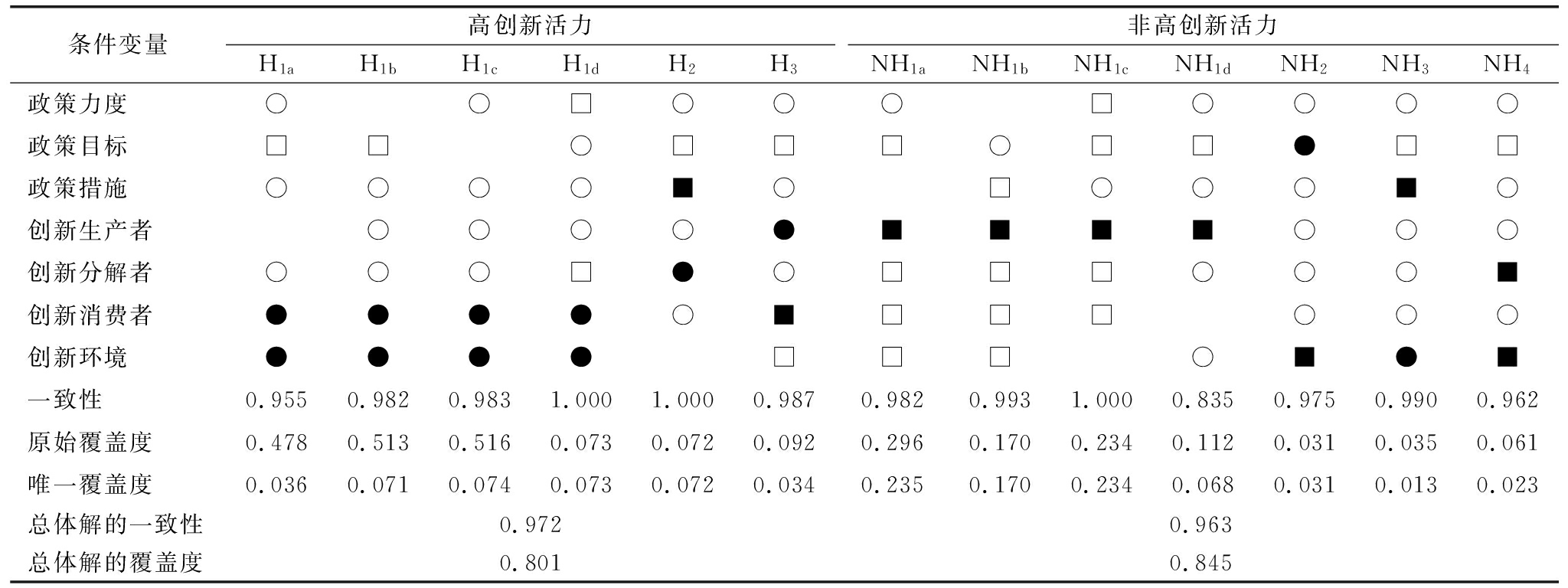 条件变量高创新活力H1aH1bH1cH1dH2H3非高创新活力NH1aNH1bNH1cNH1dNH2NH3NH4政策力度○○□○○○□○○○○政策目标□□○□□□○□□●□□政策措施○○○○■○□○○○■○创新生产者○○○○●■■■■○○○创新分解者○○○□●○□□□○○○■创新消费者●●●●○■□□□○○○创新环境●●●●□□□○■●■一致性0.9550.9820.9831.0001.0000.9870.9820.9931.0000.8350.9750.9900.962原始覆盖度0.4780.5130.5160.0730.0720.0920.2960.1700.2340.1120.0310.0350.061唯一覆盖度0.0360.0710.0740.0730.0720.0340.2350.1700.2340.0680.0310.0130.023总体解的一致性0.972 0.963 总体解的覆盖度0.8010.845