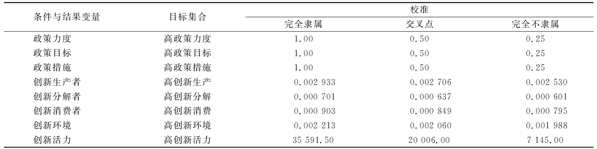 条件与结果变量目标集合校准完全隶属交叉点完全不隶属政策力度高政策力度1.000.500.25政策目标高政策目标1.000.500.25政策措施高政策措施1.000.500.25创新生产者高创新生产0.0029330.0027060.002530创新分解者高创新分解0.0007010.0006370.000601创新消费者高创新消费0.0009030.0008490.000795创新环境高创新环境0.0022130.0020600.001988创新活力高创新活力 35591.50 20006.00 7145.00