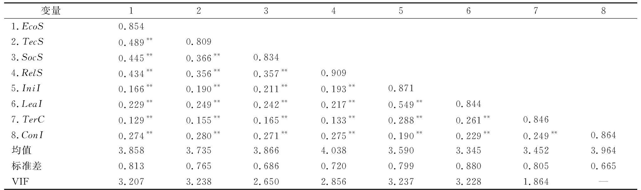 变量123456781.EcoS0.8542.TecS0.489**0.8093.SocS0.445**0.366**0.8344.RelS0.434**0.356**0.357**0.9095.IniI0.166**0.190**0.211**0.193**0.8716.LeaI0.229**0.249**0.242**0.217**0.549**0.8447.TerC0.129**0.155**0.165**0.133**0.288**0.261**0.8468.ConI0.274**0.280**0.271**0.275**0.190**0.229**0.249**0.864均值3.8583.7353.8664.0383.5903.3453.4523.964标准差0.8130.7650.6860.7200.7990.8800.8050.665VIF3.2073.2382.6502.8563.2373.2281.864—
