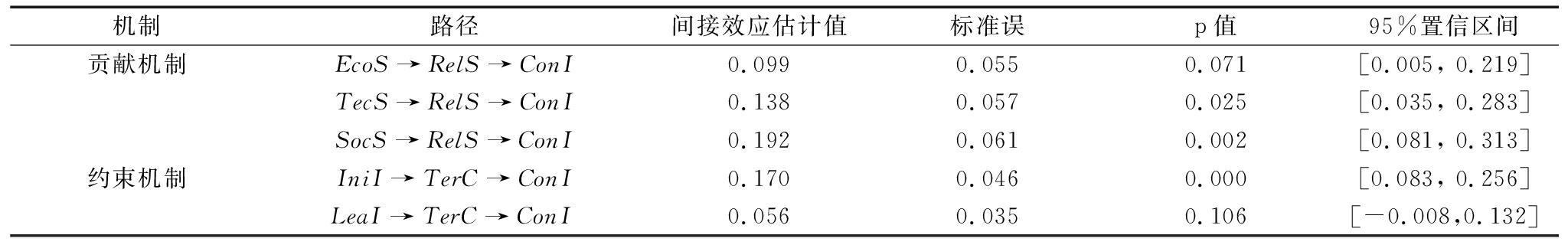 机制路径间接效应估计值标准误p值95%置信区间贡献机制EcoS→RelS→ConI0.0580.0530.276[-0.032, 0.178] TecS→RelS→ConI0.1410.0600.019[0.028, 0.265] SocS→RelS→ConI0.1590.0480.001[0.073, 0.264]约束机制IniI→TerC→ConI0.1650.0540.002[0.074, 0.286] LeaI→TerC→ConI0.0710.0390.066[-0.005, 0.148]