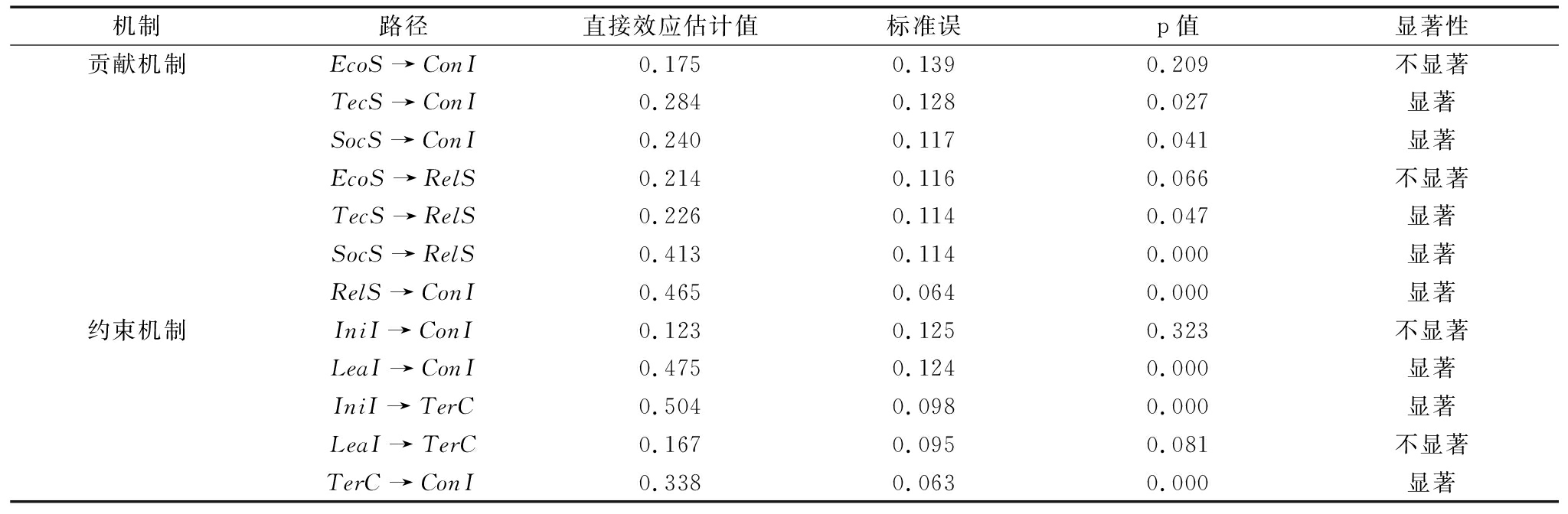 机制路径直接效应估计值标准误p值显著性 贡献机制EcoS→ConI0.1750.1390.209不显著 TecS→ConI0.2840.1280.027显著 SocS→ConI0.2400.1170.041显著 EcoS→RelS0.2140.1160.066不显著 TecS→RelS0.2260.1140.047显著 SocS→RelS0.4130.1140.000显著 RelS→ConI0.4650.0640.000显著 约束机制IniI→ConI0.1230.1250.323不显著 LeaI→ConI0.4750.1240.000显著 IniI→TerC0.5040.0980.000显著 LeaI→TerC0.1670.0950.081不显著 TerC→ConI0.3380.0630.000显著