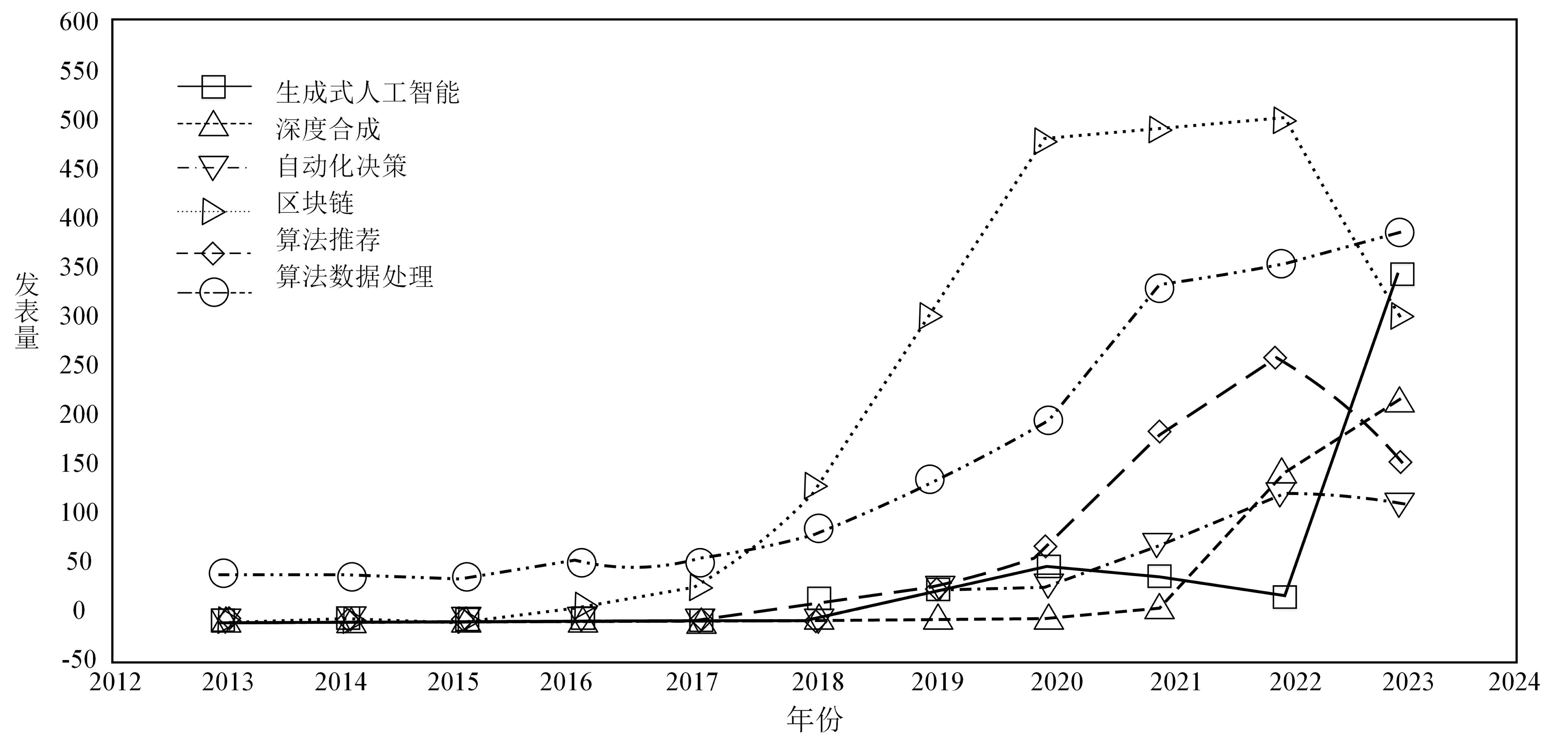 算法规制追逐技术研发热点的现象还呈现在立法研究的发展趋势中。通过文献调查与分析发现,围绕“生成式人工智能”“深度合成”“自动化决策”“区块链”“算法推荐”“算法处理数据”等技术问题,近十年相关研究成果分布如图1所示,研究的热点趋势可通过每段折线的斜率大小予以反映,斜率越大说明对应年份的研究文献增速越快,也说明对应年份中某一技术研发热点的研究热度越高。上述六大技术问题对应的折线图中,最大斜率的对应年份分别出现在2022—2023年、2021—2022年、2021—2022年、2018—2019年、2020—2021年以及2020—2021年,说明这些研究爆发的时间节点也出现在这些年份。这些研究爆发期的时间节点也与前文所述立法出台的时间节点基本吻合。
