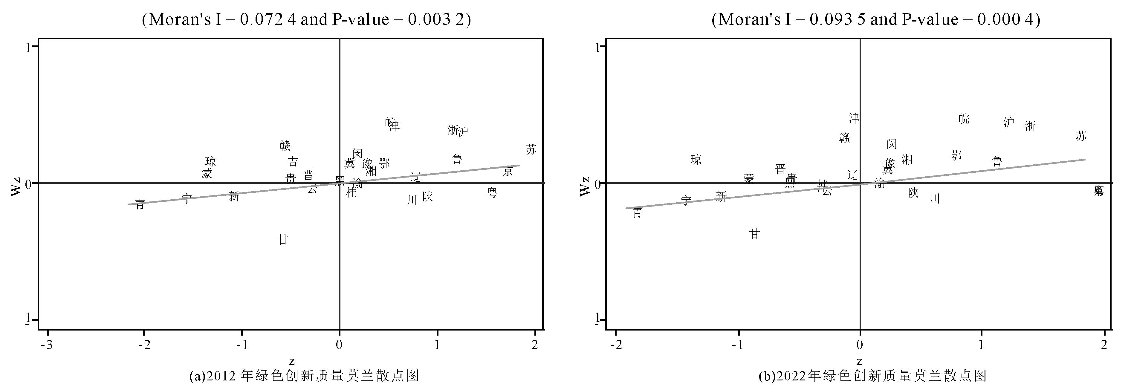 Fig.3 Moran scatterplot of the quality of green innovation in 2012 and 2022