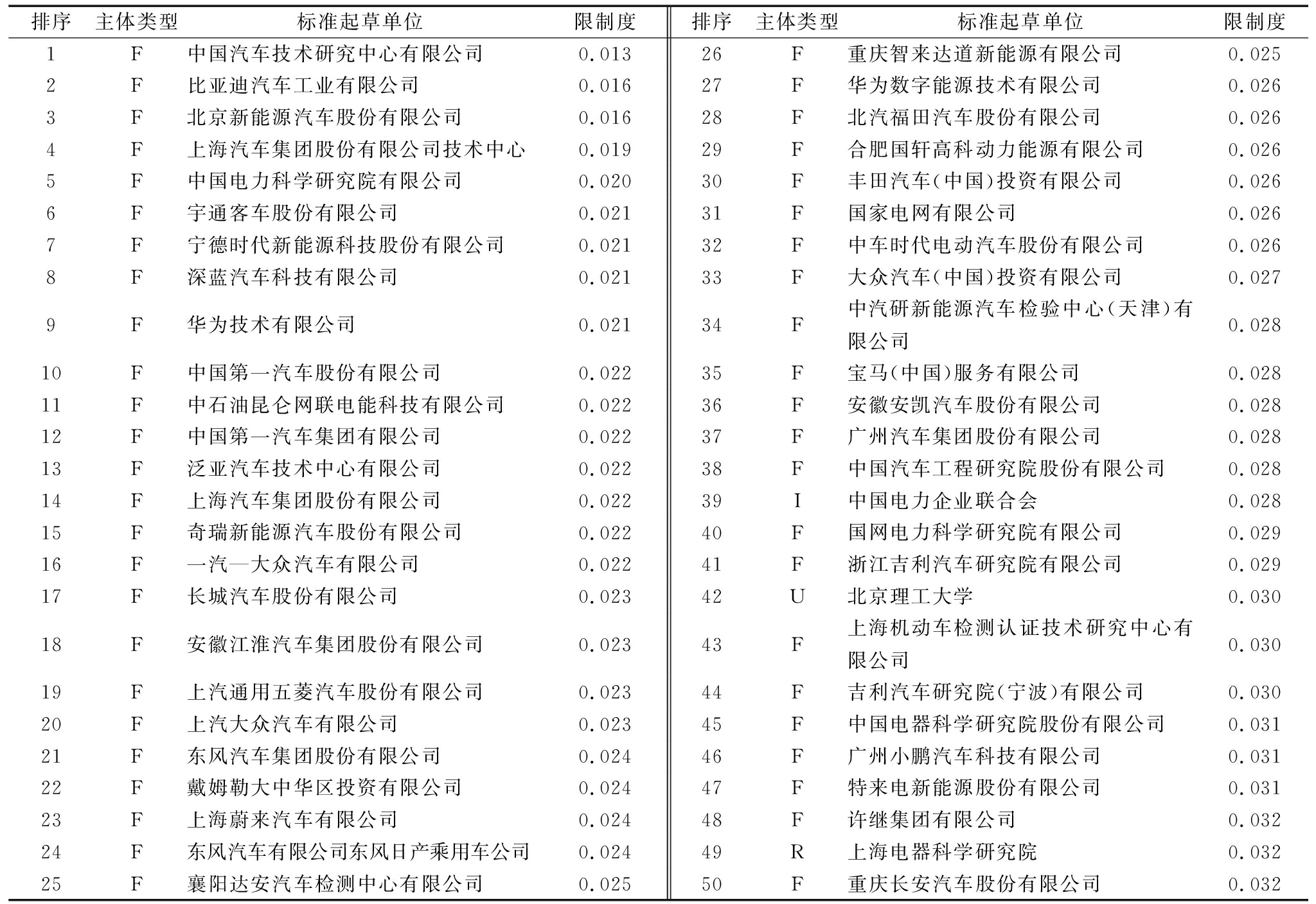结构洞理论最早由Burt于1992年提出,用于解释网络中的非冗余联系。结构洞聚焦于节点在网络中如何通过独特连接模式与周围其它节点构建关系。这并非简单重复的链接,而是跨越多个分散且不直接相连的节点群,进一步充当它们关系间断的桥接者。因此,结构洞中的占据者能够触及并整合多种网络资源,有效促进知识和信息流通与扩散。此外,结构洞连接的资源因其非冗余性而具有独特价值,占据或接近更多结构洞的节点能够获得更丰富的异质性资源。目前,常见的结构洞测量指标包括效率、有效规模、限制度和等级度等,由于限制度的重要性居于首位[27],因此本文用限制度测量我国新能源汽车产业标准合作网络中占据结构洞位置的节点。节点限制度越低,结构洞关系值越大。结构洞排名前50的标准起草单位见表4。