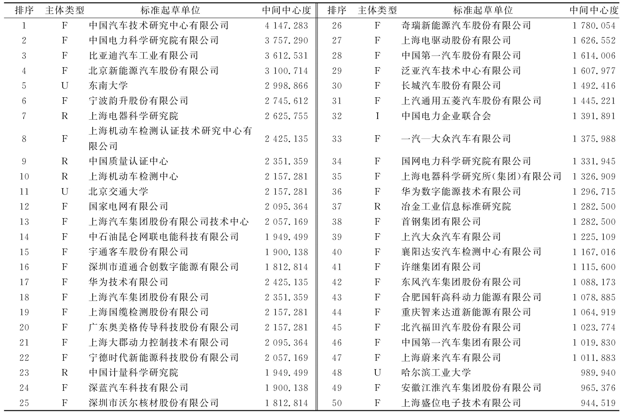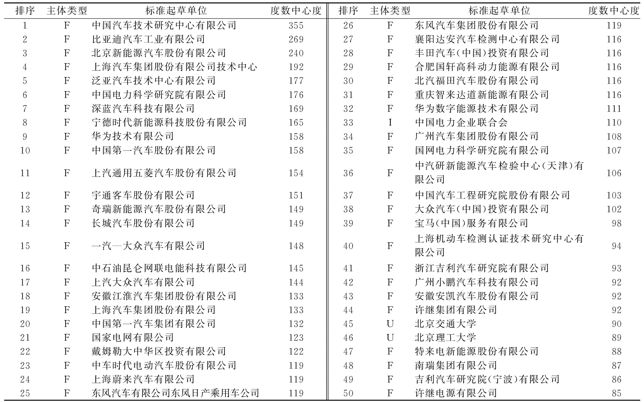 中心度是用来衡量节点在网络中相对重要性的指标,不同中心度指标可从不同角度评估节点的重要性[23],常见的中心度指标包括度数中心度、接近中心度和中间中心度等。其中,度数中心度指一个节点直接连接的边的数量[24]。一个节点的度数中心度越高,意味着它与其它节点连接的数量越多,表明该节点占据网络核心位置。表1列出我国新能源汽车产业标准合作网络中度数中心度排名前50的标准起草单位。