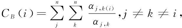 中间中心度最早由Freeman[24]于1979年提出,用于评估网络个体地位,指一个节点在所有最短路径中出现的频率[26],反映该节点的媒介程度。假设网络节点j和节点k之间存在αj,k条最短路径,节点j和k最短路径中有αj,k(i)条路径经过节点i,则节点i的中间中心度为