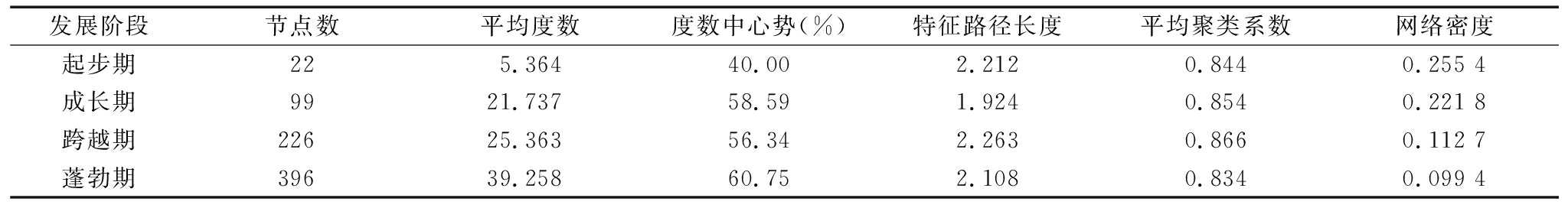 网络结构演化是一个多维度发展的动态过程,它依赖于一系列关键指标的变化。参考耿晓琴等[30]和Choi等[31]的研究,选取节点数、平均度数、度数中心势、特征路径长度、平均聚类系数和网络密度为主要指标。其中,节点数代表网络中的节点总量,平均度数描述节点的平均连接程度,度数中心势衡量各阶段网络的中心化程度,特征路径长度显示网络的全局连通性,平均聚类系数反映网络的局部连通性,网络密度则表示网络总体连接紧密度。根据我国新能源汽车产业标准合作网络生命周期演化阶段划分,运用Ucinet软件对各阶段标准合作网络拓扑结构进行测度,结果见表6。