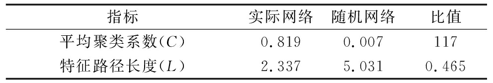 “小世界网络”是指与同规模随机网络相比,具有较短特征路径长度和较高平均聚类系数的网络结构[28],其结构特性使得信息在局部范围内迅速传播,通过少数关键节点跨距离连接其他群体,促使网络节点能够有效进行知识共享和协作,减少信息传递中间环节和时间成本。社会网络分析主要用网络平均聚类系数C和特征路径长度L两个指标对小世界网络进行测量[6],即将实际网络中这两个指标与相同规模的随机网络进行对比,如果整体网络与随机网络平均聚类系数的比值大于两者特征路径长度的比值,则说明该实际网络的小世界性显著,反之则不存在小世界性。平均聚类系数是网络中所有节点实际连接边数与最大可能连接边数之比的均值。对于有n个节点的网络,平均聚类系数