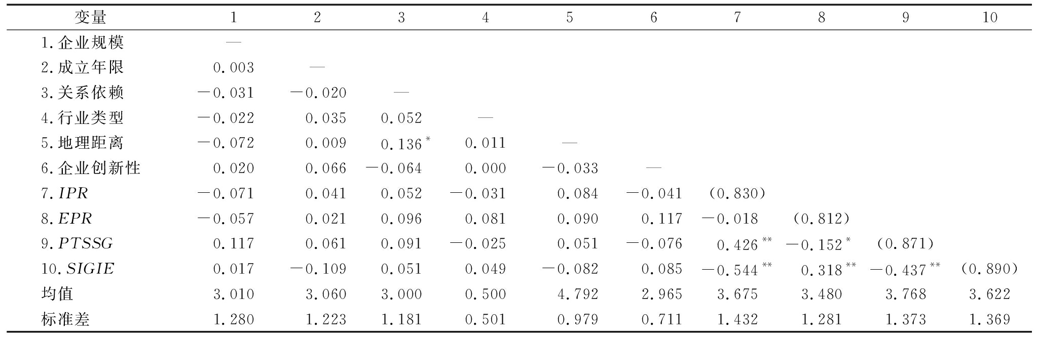 变量 1 2 3 4 5 6 7 8 9 10 1.企业规模 — 2.成立年限 0.003 — 3.关系依赖-0.031-0.020 — 4.行业类型-0.022 0.035 0.052 — 5.地理距离-0.072 0.009 0.136* 0.011 — 6.企业创新性 0.020 0.066 -0.064 0.000-0.033 — 7.IPR -0.071 0.041 0.052-0.031 0.084-0.041 (0.830) 8.EPR-0.057 0.021 0.096 0.081 0.090 0.117-0.018 (0.812) 9.PTSSG 0.117 0.061 0.091-0.025 0.051-0.076 0.426**-0.152* (0.871) 10.SIGIE 0.017-0.109 0.051 0.049-0.082 0.085-0.544** 0.318**-0.437**(0.890) 均值 3.010 3.060 3.000 0.500 4.792 2.965 3.675 3.480 3.7683.622 标准差 1.280 1.223 1.181 0.501 0.979 0.711 1.432 1.281 1.3731.369