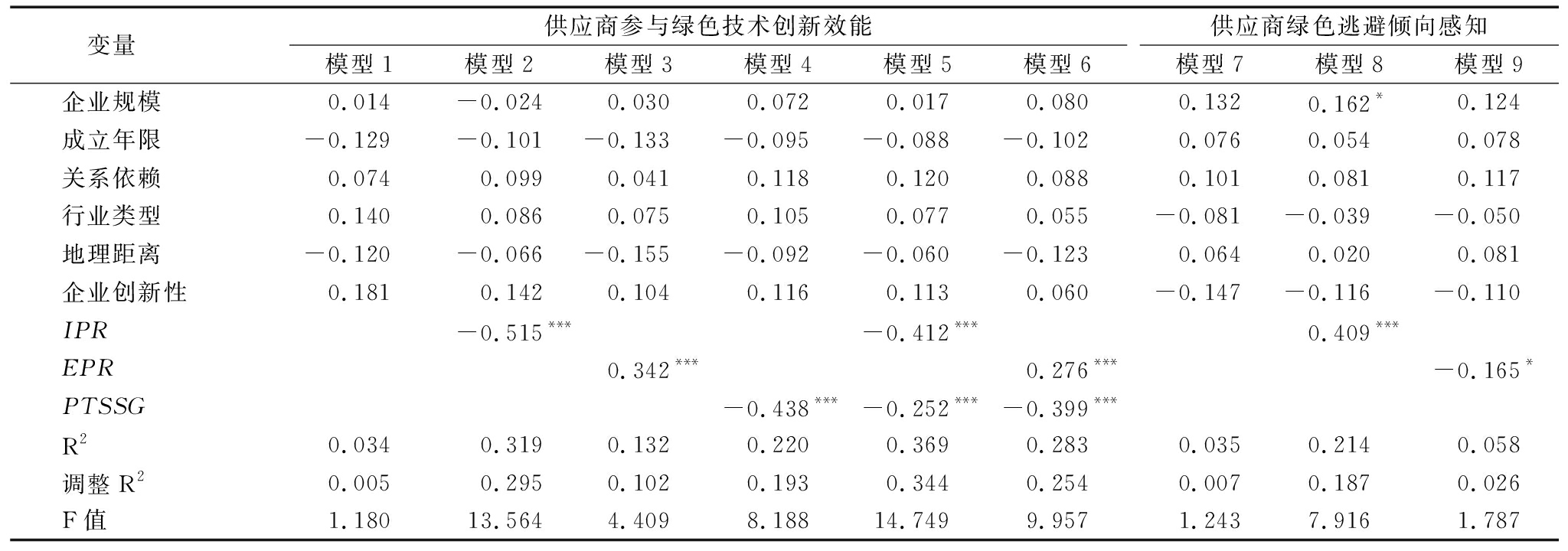 变量 供应商参与绿色技术创新效能模型1 模型2模型3 模型4 模型5 模型6供应商绿色逃避倾向感知模型7 模型8 模型9企业规模 0.014-0.024 0.030 0.072 0.017 0.080 0.132 0.162* 0.124成立年限-0.129-0.101-0.133-0.095-0.088-0.102 0.076 0.054 0.078关系依赖 0.074 0.099 0.041 0.118 0.120 0.088 0.101 0.081 0.117行业类型 0.140 0.086 0.075 0.105 0.077 0.055 -0.081-0.039-0.050地理距离-0.120-0.066-0.155-0.092-0.060-0.123 0.064 0.020 0.081企业创新性 0.181 0.142 0.104 0.116 0.113 0.060 -0.147-0.116-0.110IPR -0.515*** -0.412*** 0.409*** EPR 0.342*** 0.276*** -0.165*PTSSG -0.438***-0.252***-0.399*** R2 0.034 0.319 0.132 0.220 0.369 0.283 0.035 0.214 0.058调整R2 0.005 0.295 0.102 0.193 0.344 0.254 0.007 0.187 0.026F值 1.180 13.564 4.409 8.188 14.749 9.957 1.243 7.916 1.787