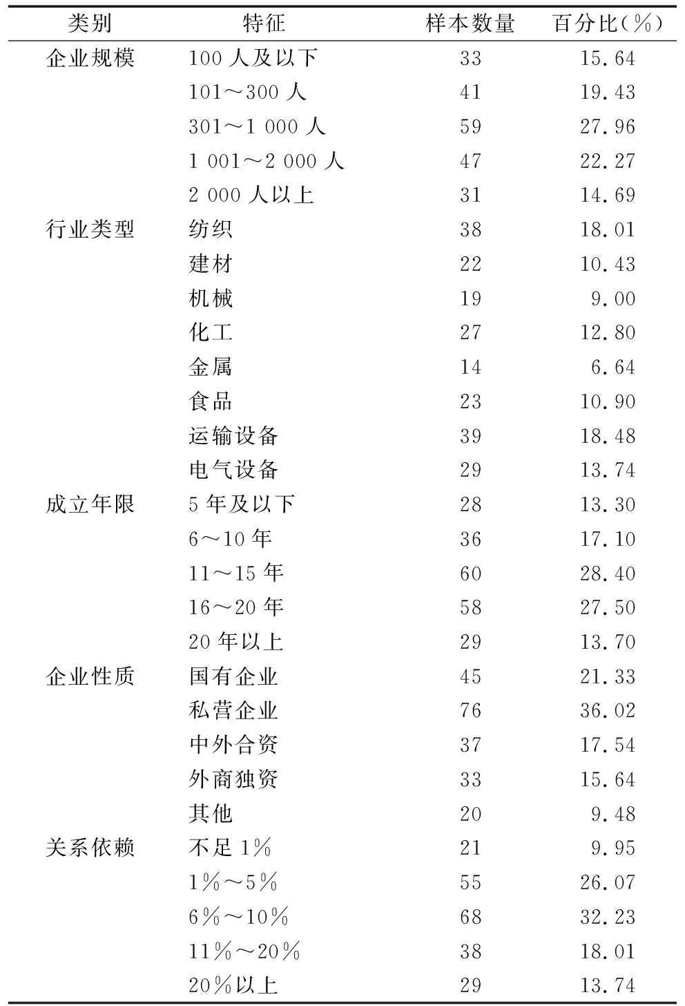 类别 特征 样本数量百分比(%)企业规模100人及以下 33 15.64 101~300人 41 19.43 301~1 000人 59 27.96 1 001~2 000人 47 22.27 2 000人以上 31 14.69行业类型 纺织 38 18.01 建材 22 10.43 机械 19 9.00 化工 27 12.80 金属 14 6.64 食品 23 10.90 运输设备 39 18.48 电气设备 29 13.74成立年限5年及以下 28 13.30 6~10年 36 17.10 11~15年 60 28.40 16~20年 58 27.50 20年以上 29 13.70企业性质国有企业 45 21.33 私营企业 76 36.02 中外合资 37 17.54 外商独资 33 15.64 其他 209.48关系依赖不足1% 21 9.95 1%~5% 55 26.07 6%~10% 68 32.23 11%~20% 38 18.01 20%以上 29 13.74