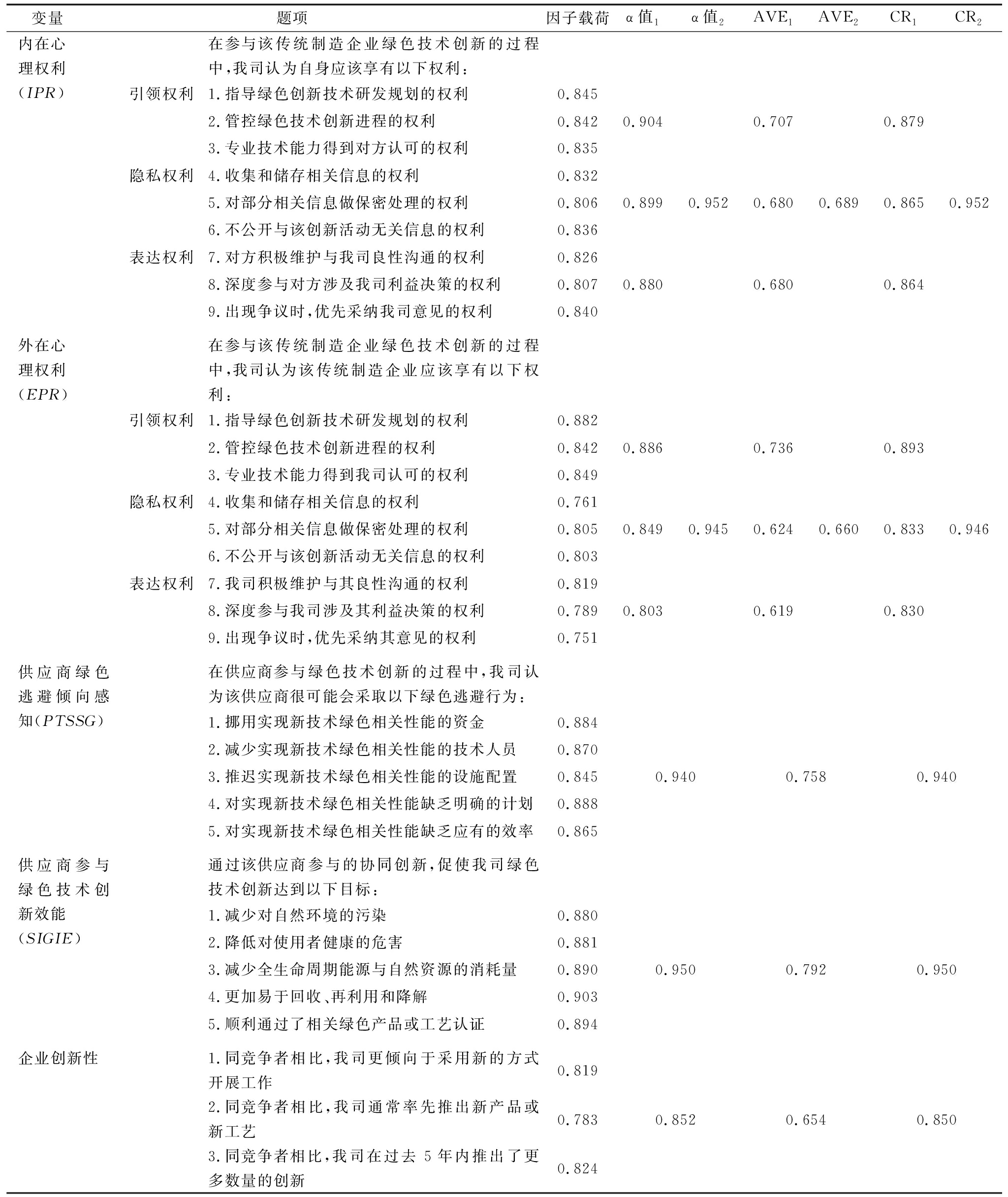 变量 题项 因子载荷α值1α值2AVE1AVE2CR1CR2内在心理权利(IPR) 在参与该传统制造企业绿色技术创新的过程中,我司认为自身应该享有以下权利: 引领权利1.指导绿色创新技术研发规划的权利0.845 2.管控绿色技术创新进程的权利0.8420.9040.7070.879 3.专业技术能力得到对方认可的权利0.835 隐私权利4.收集和储存相关信息的权利0.832 5.对部分相关信息做保密处理的权利0.806 0.899 0.952 0.680 0.689 0.8650.952 6.不公开与该创新活动无关信息的权利0.836 表达权利7.对方积极维护与我司良性沟通的权利0.826 8.深度参与对方涉及我司利益决策的权利0.807 0.880 0.680 0.864 9.出现争议时,优先采纳我司意见的权利0.840 外在心理权利(EPR) 在参与该传统制造企业绿色技术创新的过程中,我司认为该传统制造企业应该享有以下权利: 引领权利1.指导绿色创新技术研发规划的权利0.882 2.管控绿色技术创新进程的权利0.842 0.8860.7360.893 3.专业技术能力得到我司认可的权利0.849 隐私权利4.收集和储存相关信息的权利0.761 5.对部分相关信息做保密处理的权利0.8050.8490.9450.6240.6600.8330.946 6.不公开与该创新活动无关信息的权利0.803 表达权利7.我司积极维护与其良性沟通的权利0.819 8.深度参与我司涉及其利益决策的权利0.7890.803 0.619 0.830 9.出现争议时,优先采纳其意见的权利0.751供应商绿色逃避倾向感知(PTSSG) 在供应商参与绿色技术创新的过程中,我司认为该供应商很可能会采取以下绿色逃避行为: 1.挪用实现新技术绿色相关性能的资金0.884 2.减少实现新技术绿色相关性能的技术人员0.870 3.推迟实现新技术绿色相关性能的设施配置0.845 0.940 0.758 0.940 4.对实现新技术绿色相关性能缺乏明确的计划0.888 5.对实现新技术绿色相关性能缺乏应有的效率0.865供应商参与绿色技术创新效能(SIGIE)通过该供应商参与的协同创新,促使我司绿色技术创新达到以下目标: 1.减少对自然环境的污染0.880 2.降低对使用者健康的危害0.881 3.减少全生命周期能源与自然资源的消耗量0.890 0.950 0.792 0.950 4.更加易于回收、再利用和降解0.903 5.顺利通过了相关绿色产品或工艺认证0.894企业创新性1.同竞争者相比,我司更倾向于采用新的方式开展工作0.819 2.同竞争者相比,我司通常率先推出新产品或新工艺0.783 0.852 0.654 0.850 3.同竞争者相比,我司在过去 5年内推出了更多数量的创新0.824