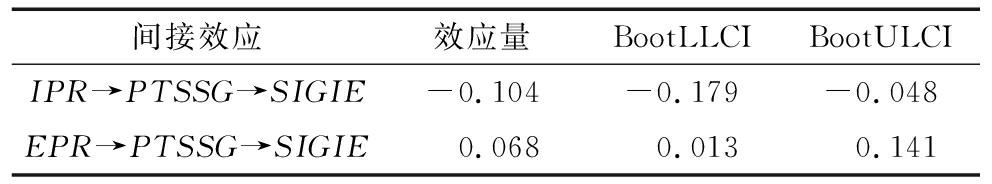 间接效应 效应量 BootLLCI BootULCI IPR→PTSSG→SIGIE -0.104 -0.179 -0.048 EPR→PTSSG→SIGIE 0.068 0.013 0.141