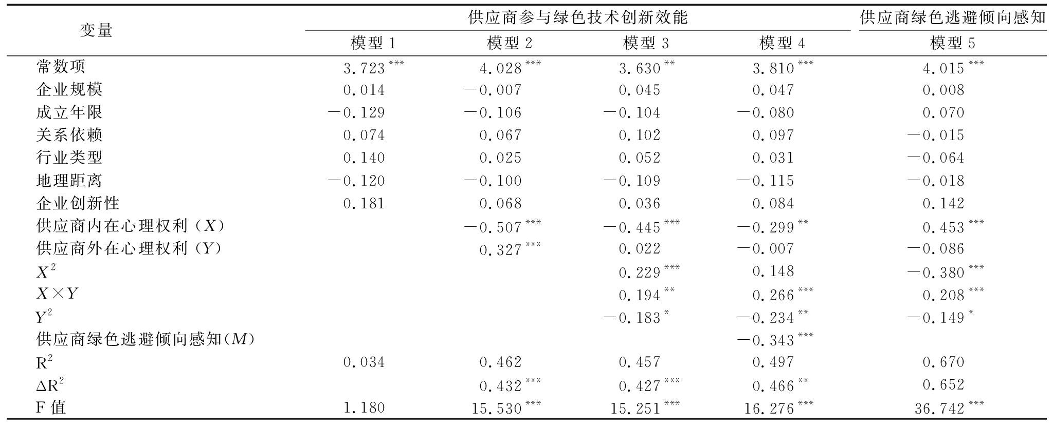 变量 供应商参与绿色技术创新效能模型1 模型2 模型3 模型4供应商绿色逃避倾向感知模型5 常数项 3.723*** 4.028*** 3.630** 3.810*** 4.015*** 企业规模 0.014-0.007 0.045 0.047 0.008 成立年限-0.129-0.106-0.104-0.080 0.070 关系依赖 0.074 0.067 0.102 0.097 -0.015 行业类型 0.140 0.025 0.052 0.031 -0.064 地理距离-0.120-0.100-0.109-0.115 -0.018 企业创新性 0.181 0.068 0.036 0.084 0.142 供应商内在心理权利 (X) -0.507***-0.445***-0.299** 0.453*** 供应商外在心理权利 (Y) 0.327*** 0.022-0.007 -0.086 X2 0.229*** 0.148 -0.380*** X×Y 0.194** 0.266*** 0.208*** Y2 -0.183*-0.234** -0.149* 供应商绿色逃避倾向感知(M) -0.343*** R2 0.034 0.462 0.457 0.497 0.670 ΔR2 0.432*** 0.427*** 0.466** 0.652 F值 1.18015.530*** 15.251*** 16.276*** 36.742***