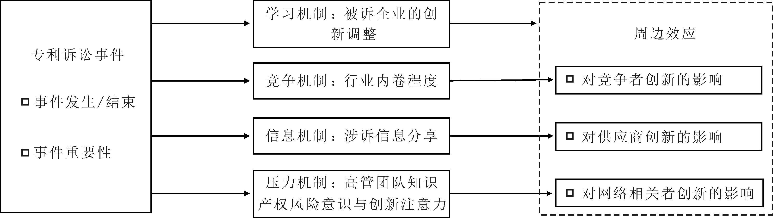 根据社会互动、事件系统、社会网络、动态竞争等相关基础理论,构建被告企业专利诉讼事件对周边企业创新的影响效应识别理论模型(如图2所示)。