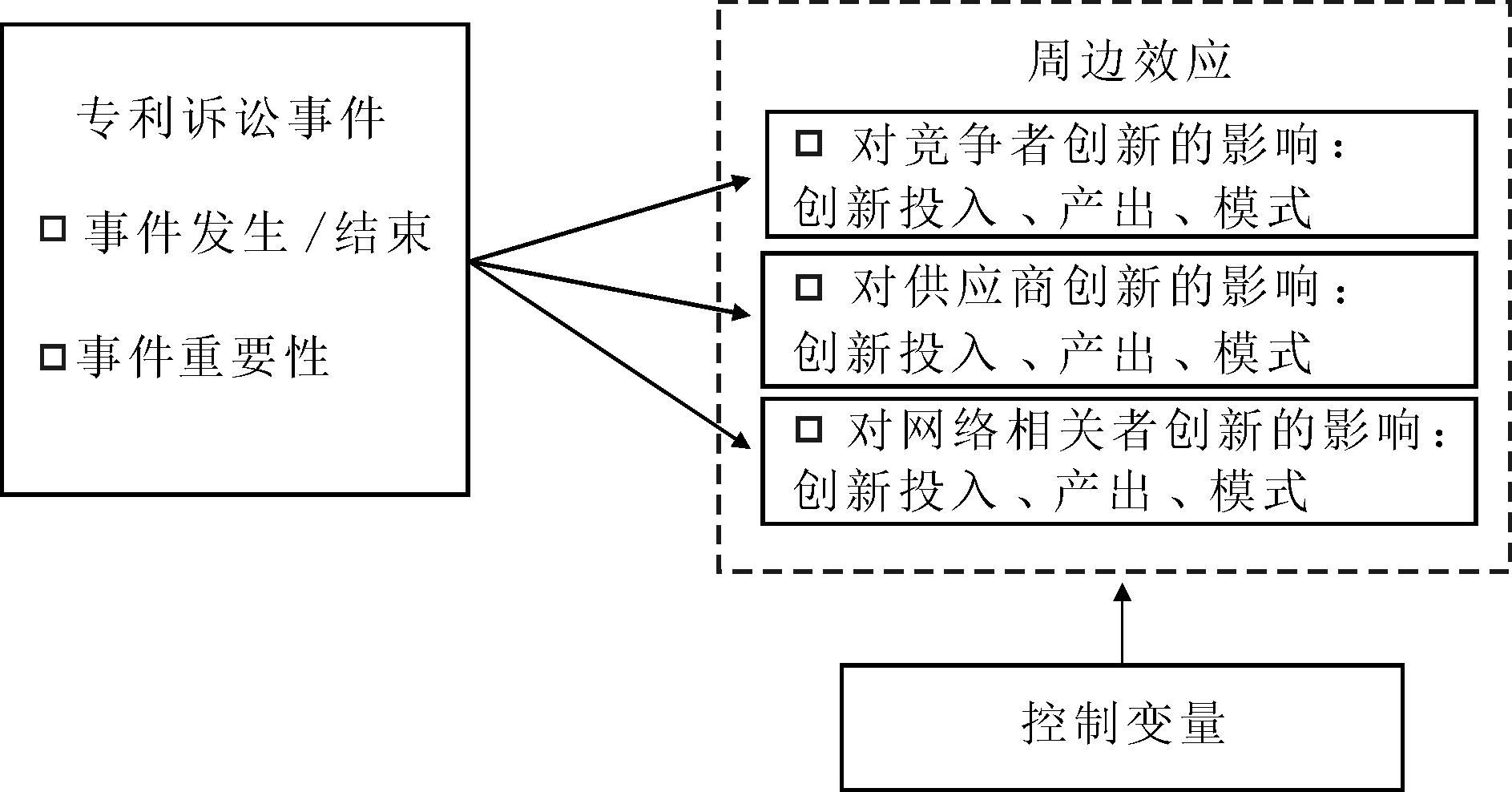 综上所述,同群效应研究覆盖领域广,在管理领域研究中发展迅速,重点关注负面事件在组织间的溢出效应,但现有研究对专利诉讼事件的同群效应关注不足。鉴于专利诉讼事件不断增多,特别是关键专利诉讼事件影响广泛,开展专利诉讼事件的同群效应研究具有理论和实践意义。因此,本文将专利诉讼事件纳入基于事件的同群效应研究范畴,从事件系统理论视角出发,对专利诉讼事件影响企业创新的同群效应进行深入考察。