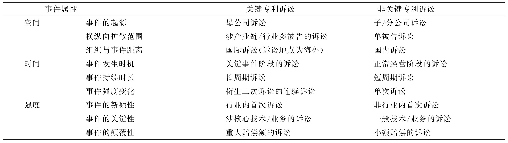 根据事件系统理论[24],可以从空间、时间以及强度3个属性对专利诉讼事件进行分类。空间属性包括事件起源、扩散以及距离;时间属性包括事件发生时机、持续时长以及强度变化;强度属性包括新颖性、关键性以及颠覆性,具体如表1所示。从空间属性的起源看,可将母公司诉讼确定为关键专利诉讼事件;从时间属性的发生时机看,可将关键事件阶段(如首次公开上市、进军新市场、发布新产品)的诉讼视为关键专利诉讼事件;从强度属性的颠覆性看,可将重大赔偿额作为界定关键专利诉讼事件的标准。
