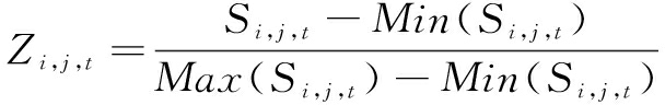 其中,Si,j,t为标准化前t年i专利第j个指标值,Zi,j,t为标准化后t年i专利第j个指标值,Min(Si,j,t)和Max(Si,j,t)分别为t年i专利第j个指标的最小值与最大值。