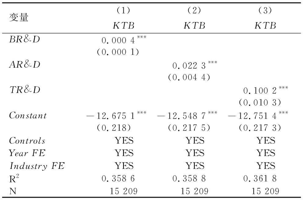 变量(1)(2)(3)KTBKTBKTBBR&D0.000 4***(0.000 1)AR&D0.022 3***(0.004 4)TR&D0.100 2***(0.010 3)Constant-12.675 1***-12.548 7***-12.751 4***(0.218)(0.217 5)(0.217 3)ControlsYESYESYESYear FEYESYESYESIndustry FEYESYESYESR20.358 60.358 80.361 8N15 20915 20915 209