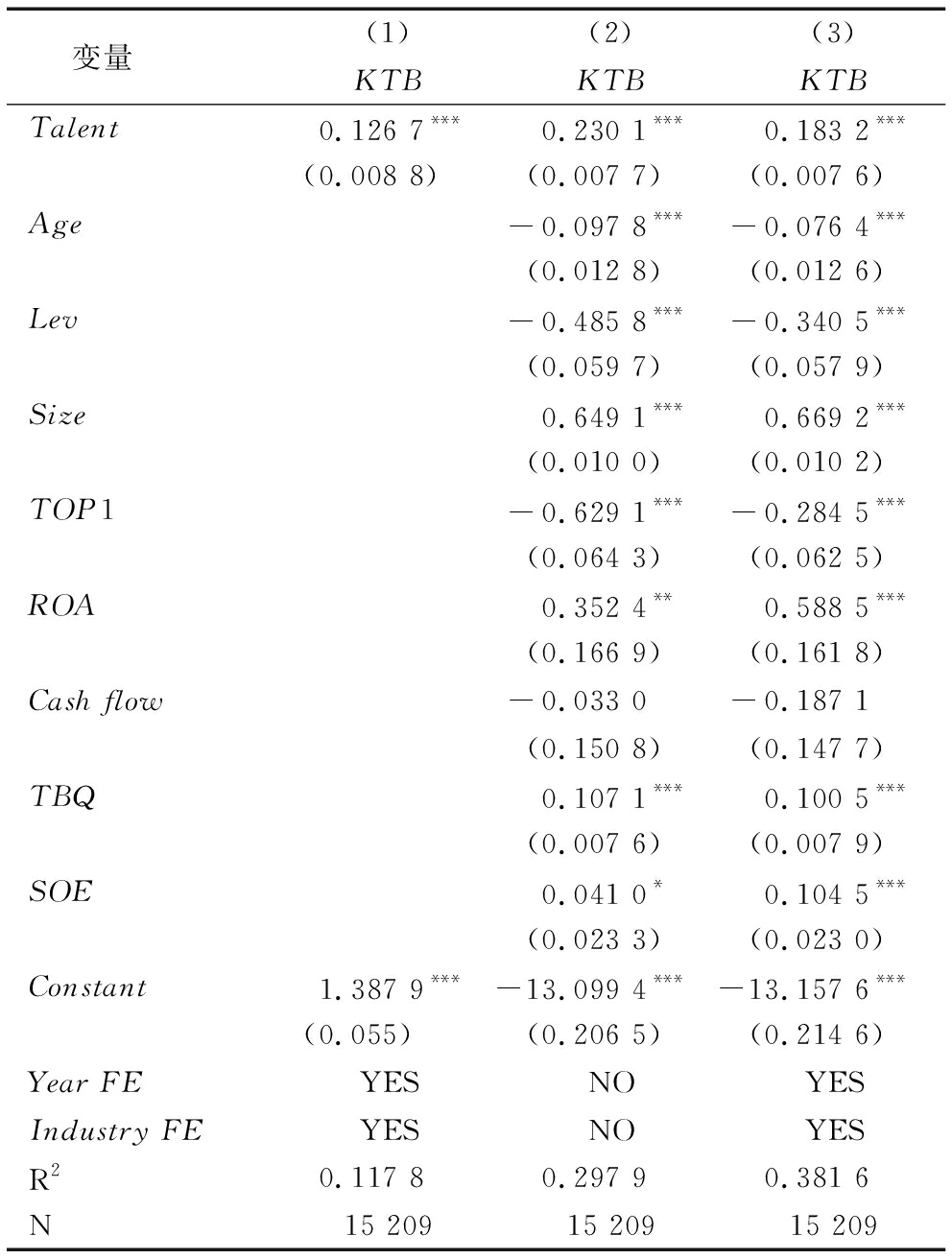 变量(1)(2)(3)KTBKTBKTBTalent0.126 7***0.230 1***0.183 2***(0.008 8)(0.007 7)(0.007 6)Age-0.097 8***-0.076 4***(0.012 8)(0.012 6)Lev-0.485 8***-0.340 5***(0.059 7)(0.057 9)Size0.649 1***0.669 2***(0.010 0)(0.010 2)TOP1-0.629 1***-0.284 5***(0.064 3)(0.062 5)ROA0.352 4**0.588 5***(0.166 9)(0.161 8)Cash flow-0.033 0-0.187 1(0.150 8)(0.147 7)TBQ0.107 1***0.100 5***(0.007 6)(0.007 9)SOE0.041 0*0.104 5***(0.023 3)(0.023 0)Constant1.387 9***-13.099 4***-13.157 6***(0.055)(0.206 5)(0.214 6)Year FEYESNOYESIndustry FEYESNOYESR20.117 80.297 90.381 6N15 20915 20915 209